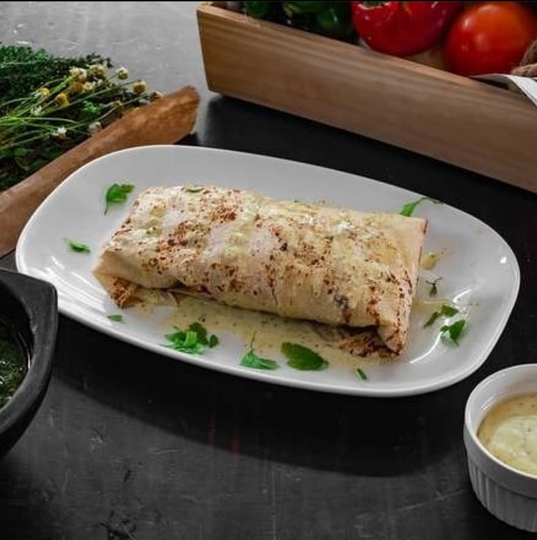 Rollo de pan árabe envuelto, relleno con champiñón, lechuga, queso, maíz, tomate y salsa de la casa.