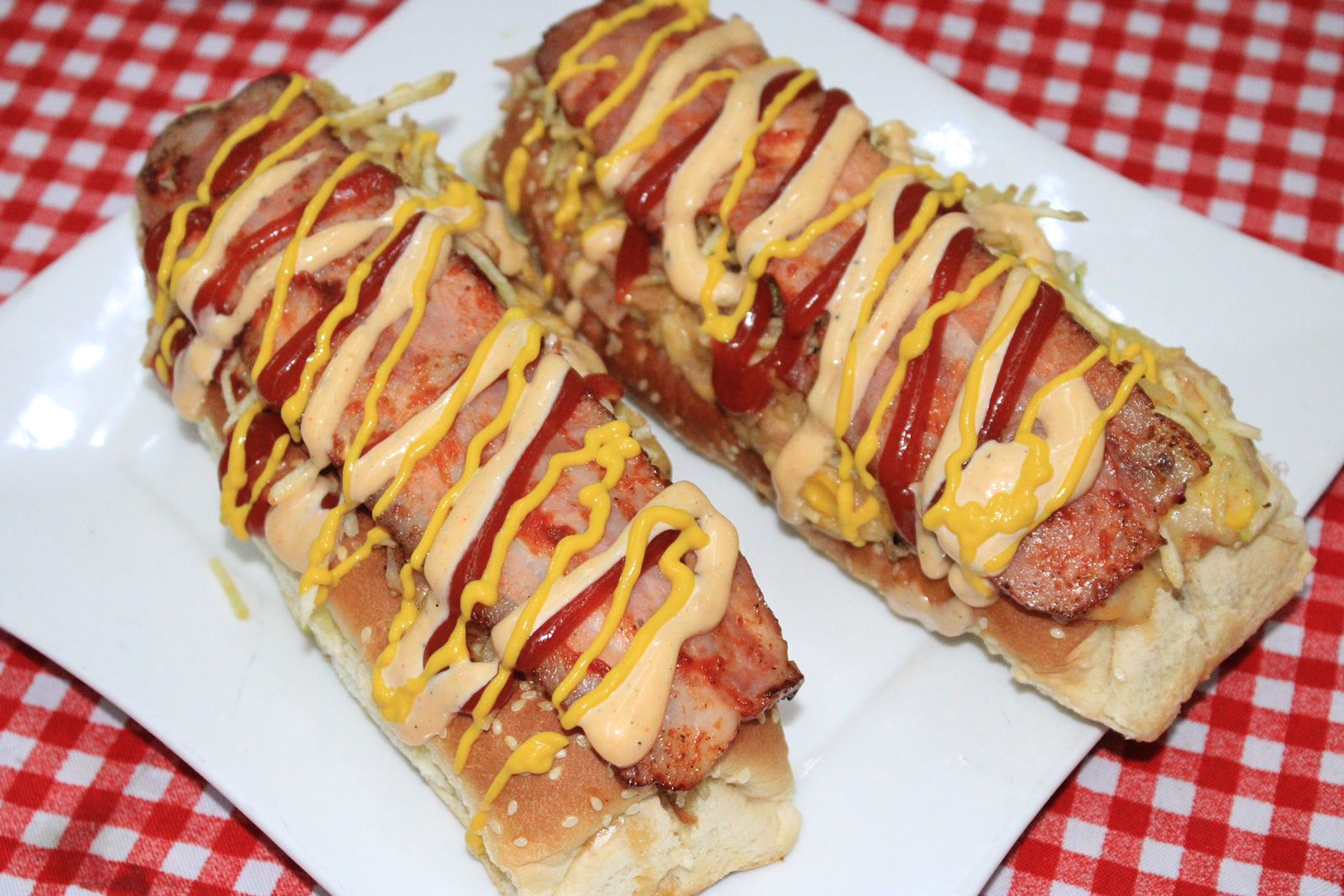 Pan bimbo, salchicha tradicional, queso doble crema, jamón y salsas