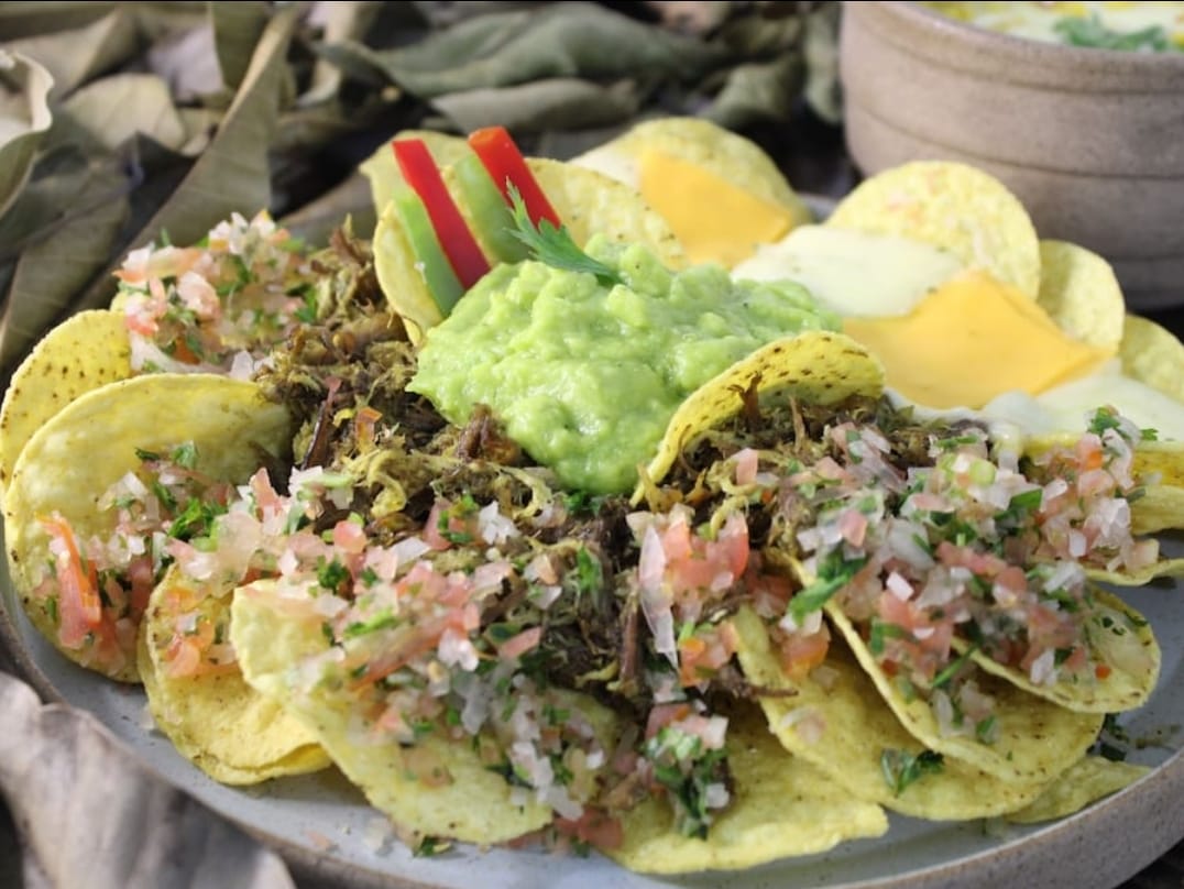 Trozos de tortilla de maíz fritos, acompañado de carne de res desmechada y pollo, verduras, guacamole, queso, pico de gallo y salsa de la casa.