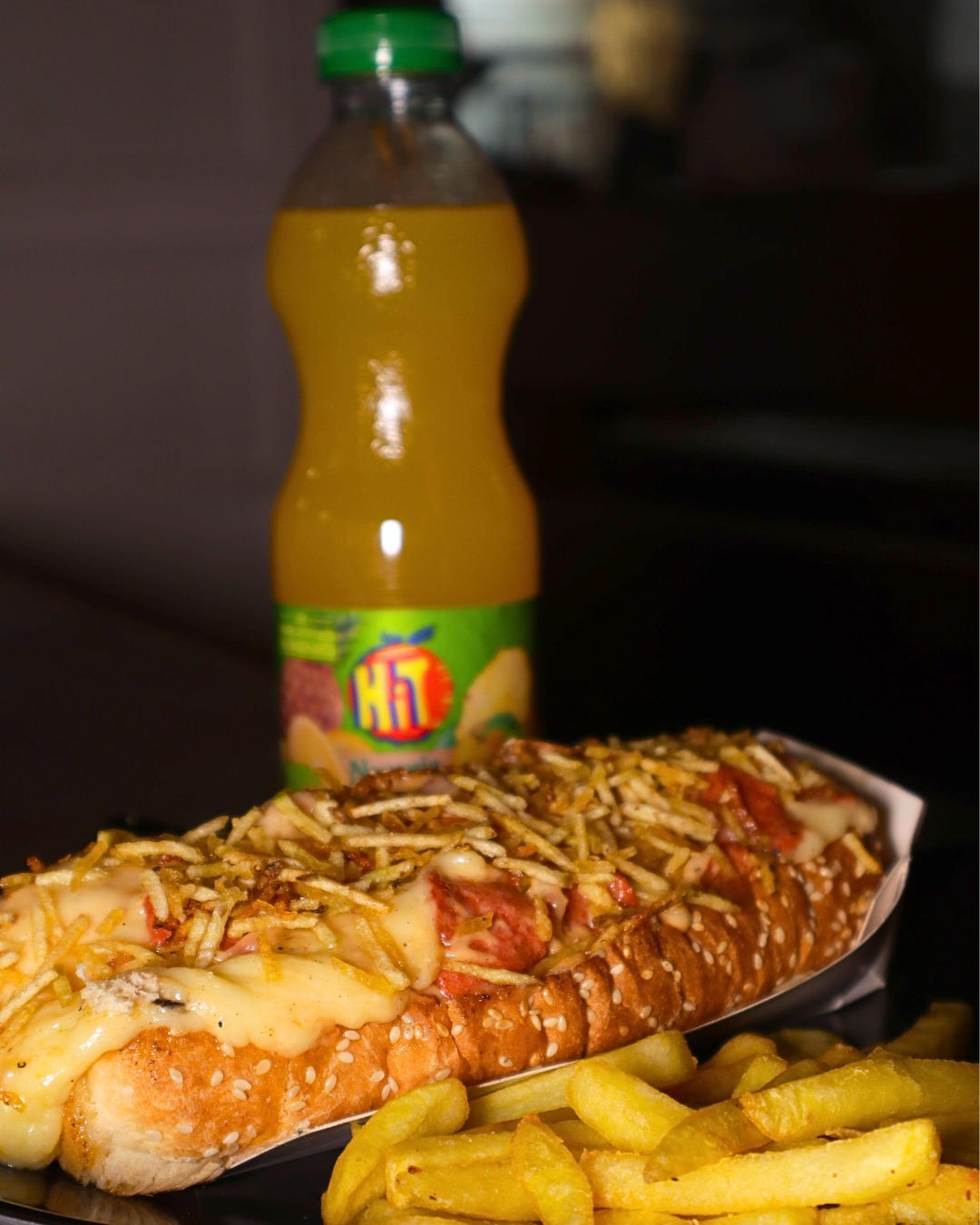 Perro Caliente Sencillo: Pan bimbo, salchicha tradicional, queso doble crema, jamón y salsas, Acompañado de Porción de Papas francesas y Jugo Hit 500Ml