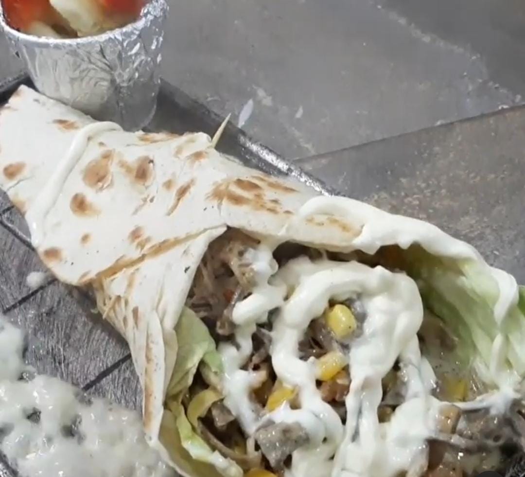 Rollo de pan servilleta árabe envuelto de trozos de pollo, cerdo, tocineta, lechuga, tomate y salsa de la casa.