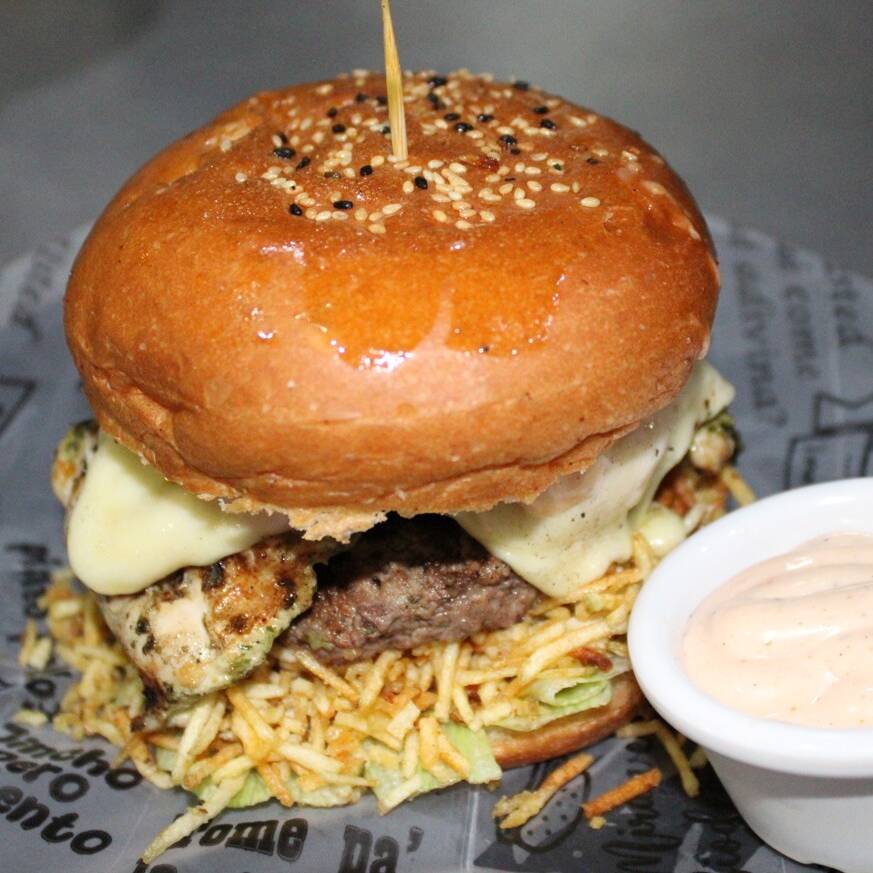 Hamburguesa mixta, acompañada de pan artesanal, 180 g carne, filete de pollo, queso, tocineta y salsa.