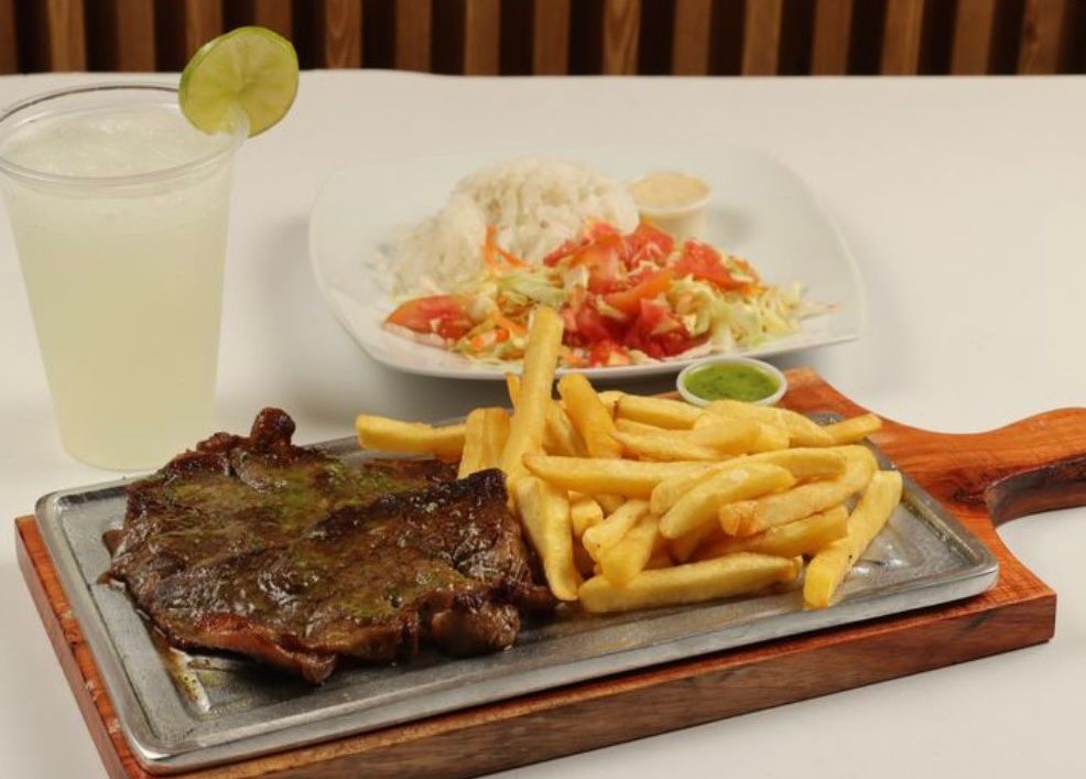 250 gramos de lomo caracho acompañado de arroz, papas a la francesa y ensalada