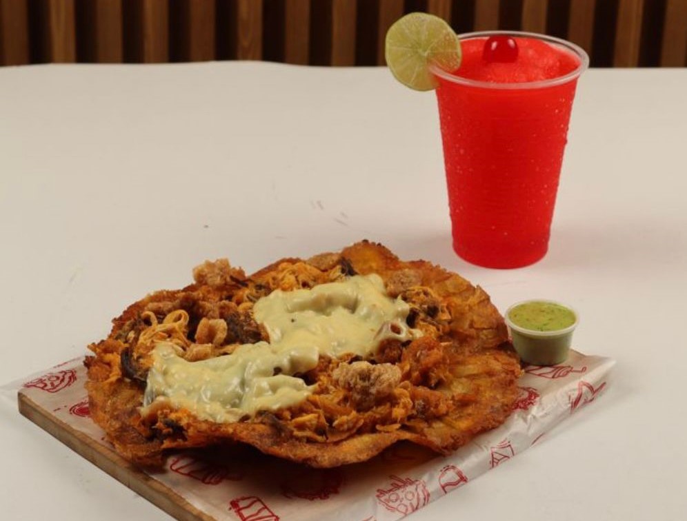 Carne mechada, pollo mechado, chicharron, queso crema y guiso de la casa