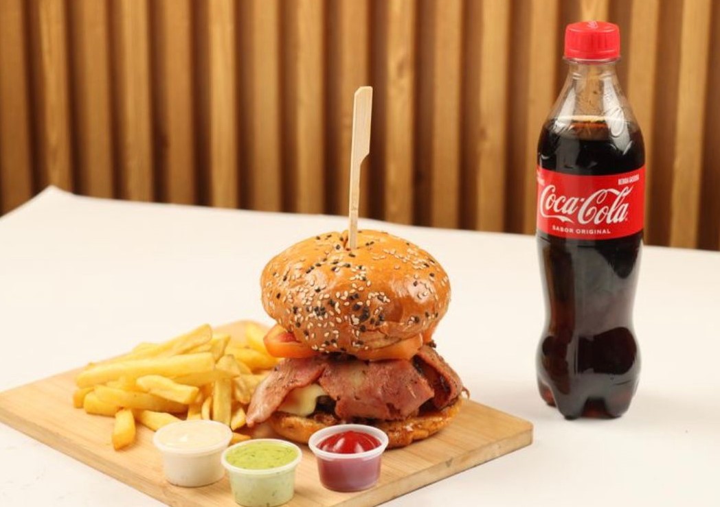 Deliciosa hamburguesa con carne Angus, pan brioche, tomate, cebolla crispy, tocineta, queso, salsa de la casa, papas a la francesa y coca cola pet 400