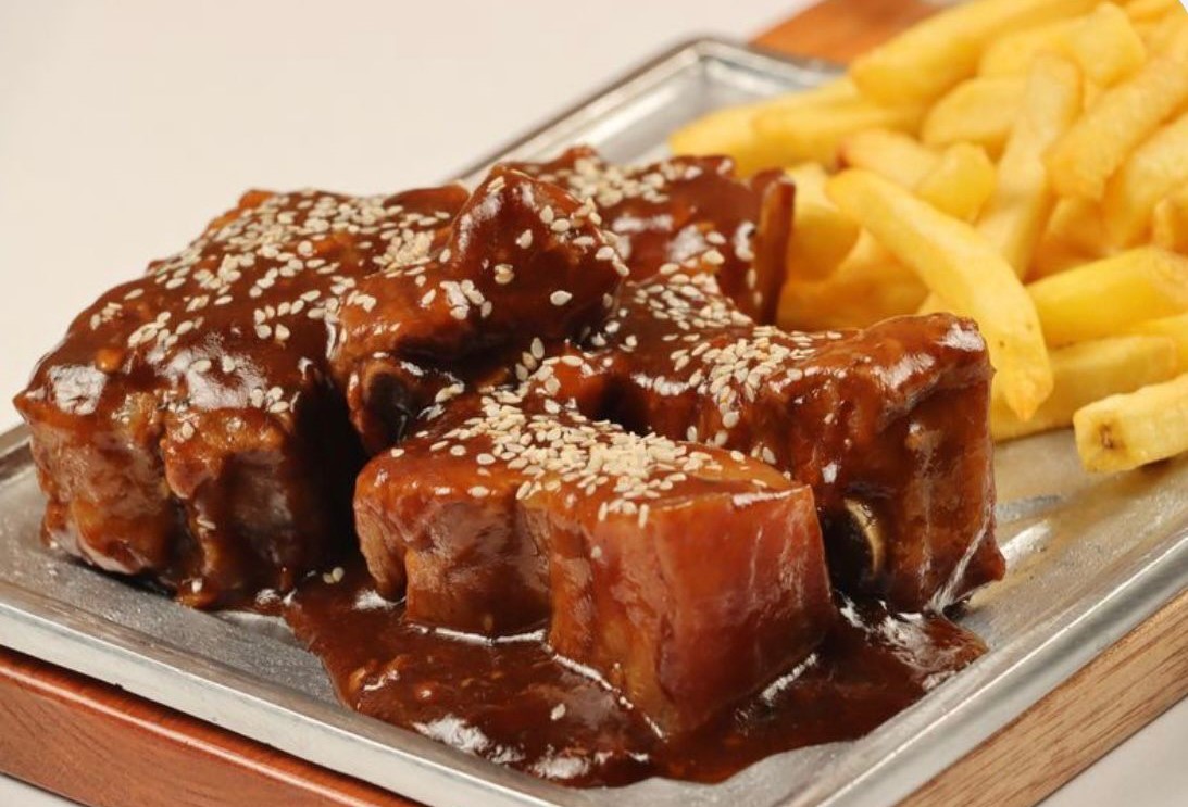 Costilla a la BBQ, acompañada de arroz blanco, papas a la francesa y ensalada verde.