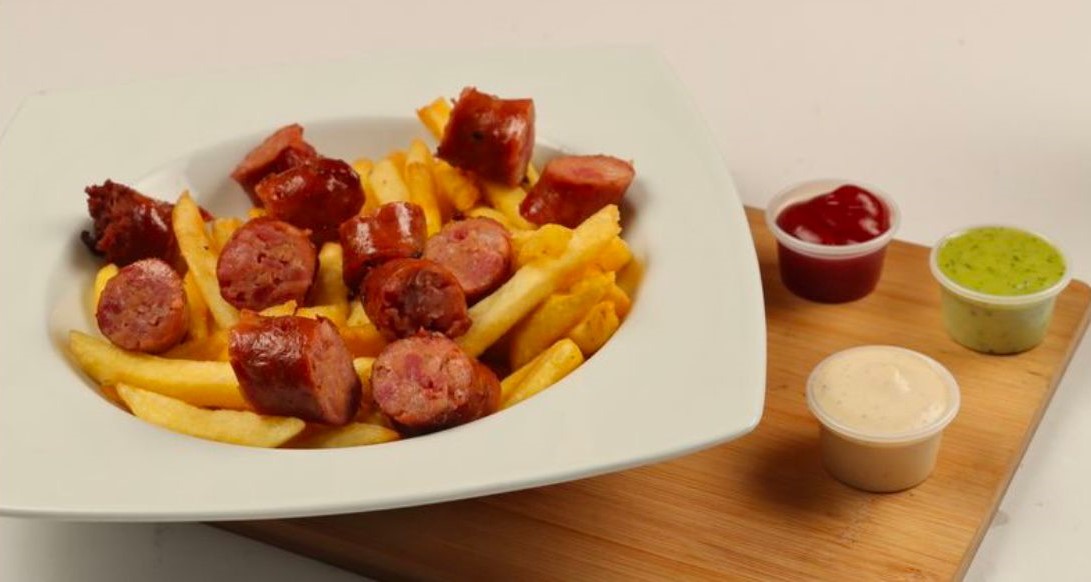 2 chorizos santarrosano, con papas a la francesa y queso gratinado