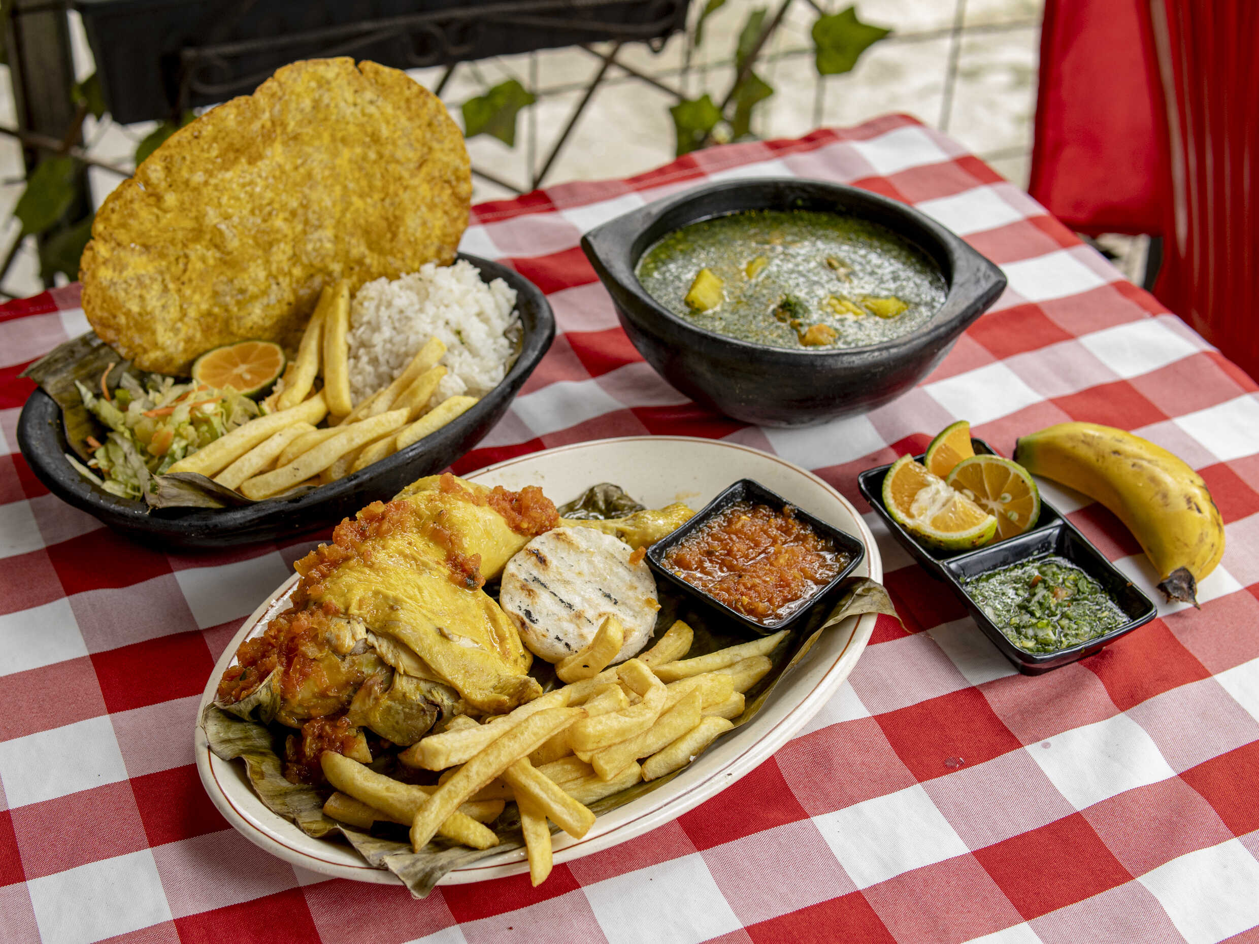 Chuleta de pollo, arroz, ensalada (tomate, lechuga y cebolla), papas a la francesa, tostada de plátano y sancocho de gallina.