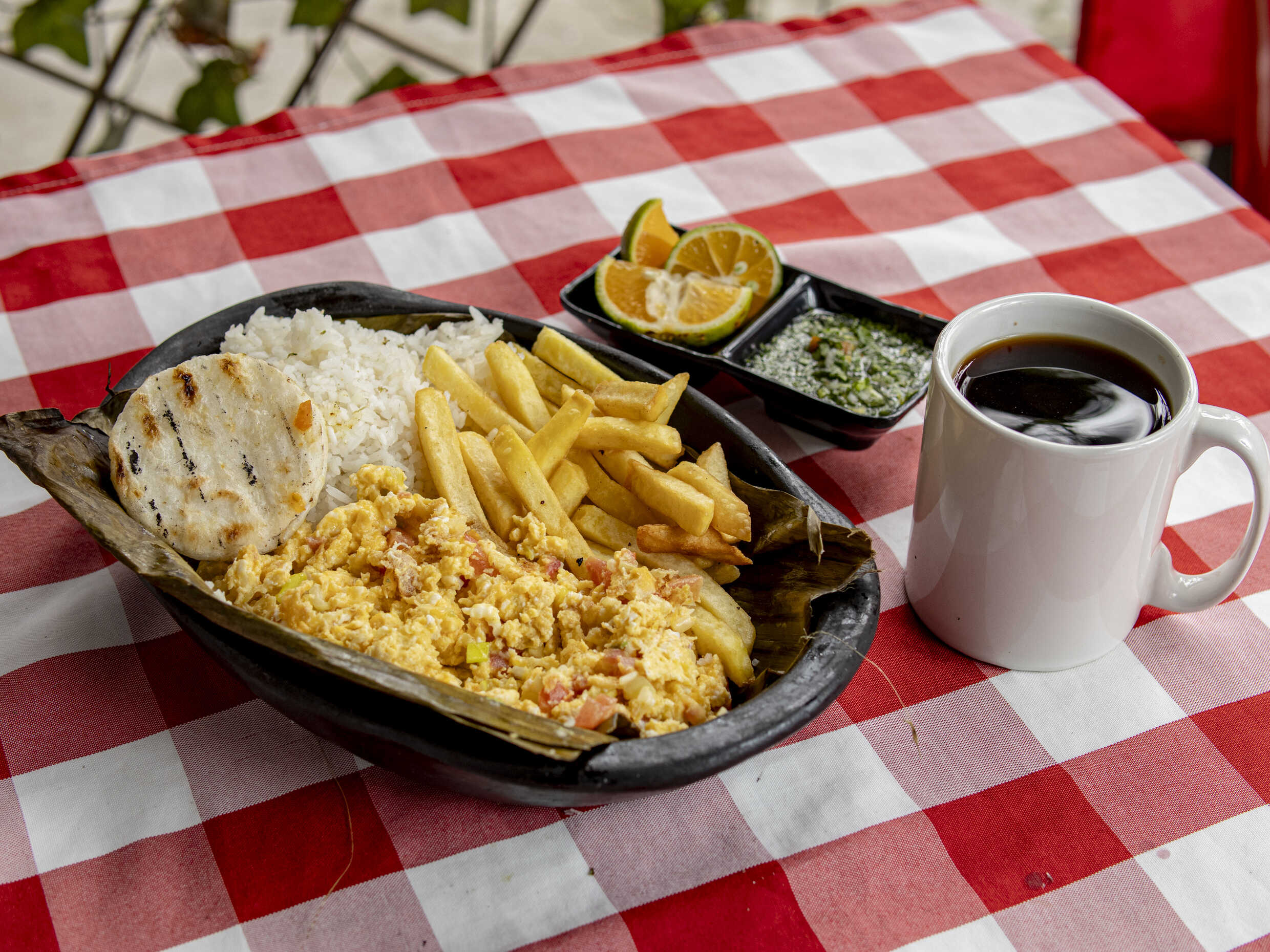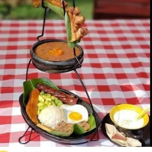 Proteina a eleccion, acompañada de arroz, tostada de platano, tajada, papa a la francesa, arepita acompañado de cafe negro o limonada