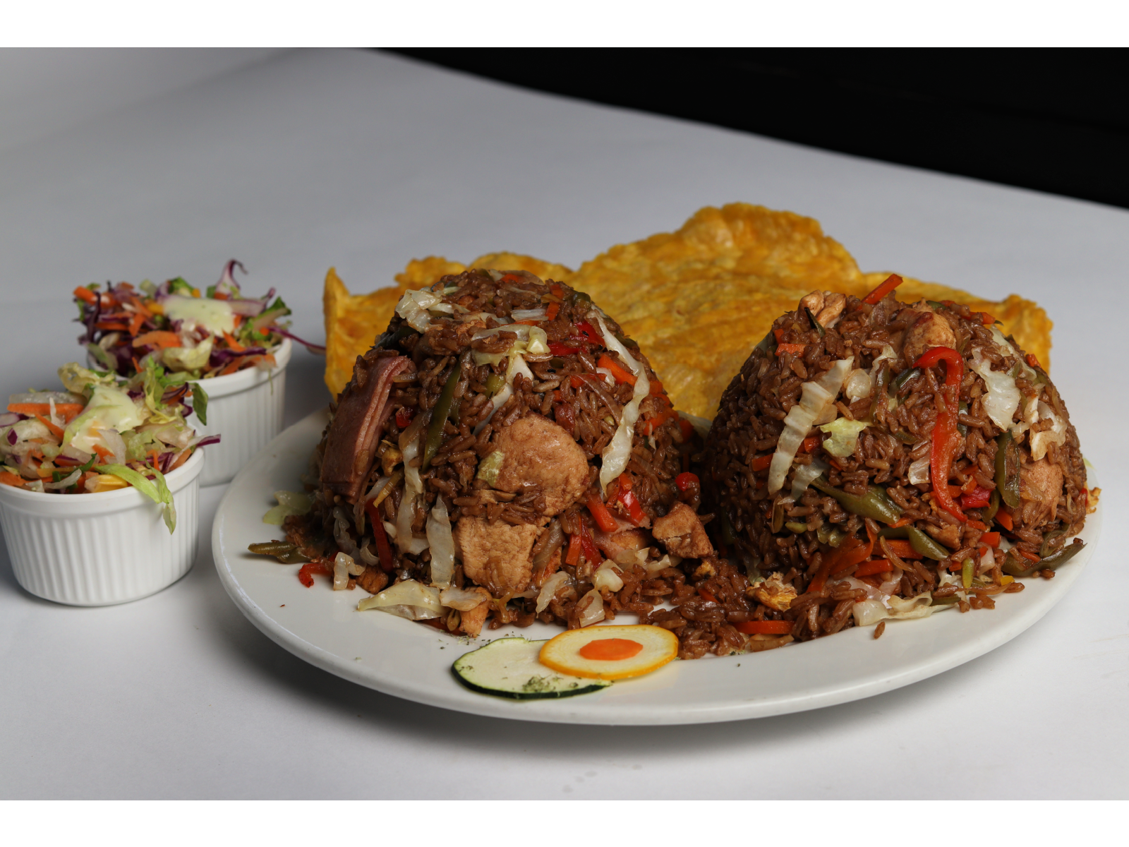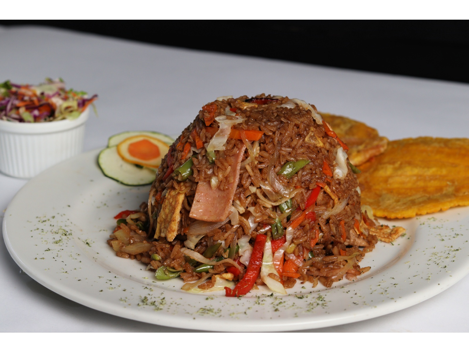 Arroz mixto 800g Pollo, cerdo, jamón, huevo, acompañado con 4 tostadas de plátano y dos ensaladas de la casa.
