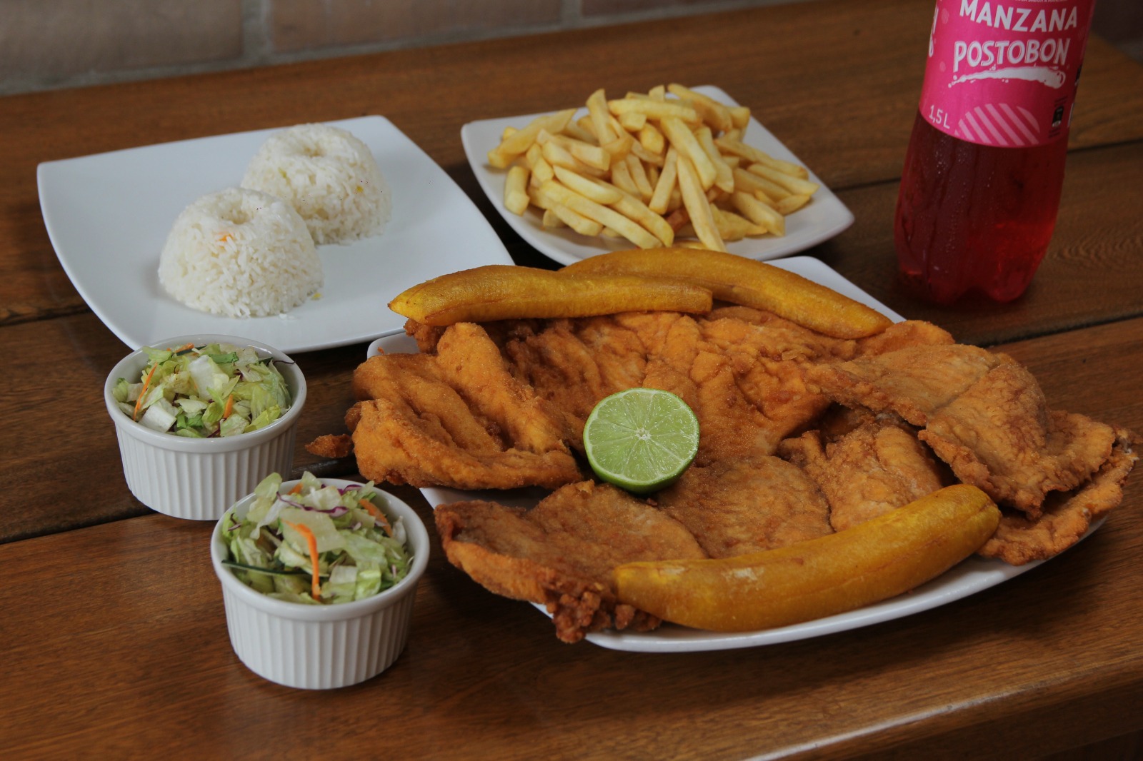 Chuleta de Pollo Pinino de 1000g, acompañada de porción de papas a la francesa, tres porciones de arroz, dos ensaladas de la casa y tres maduros + Gaseosa Litro (sabor Manzana)