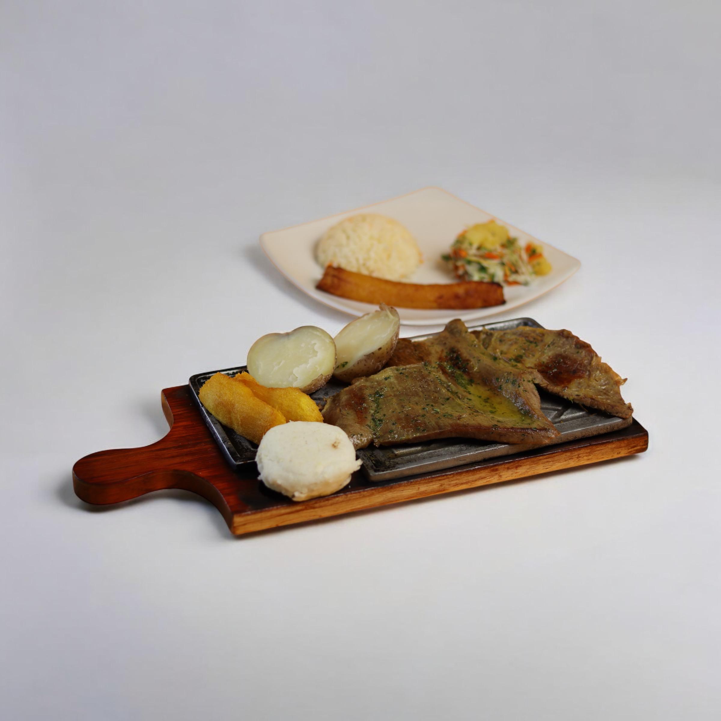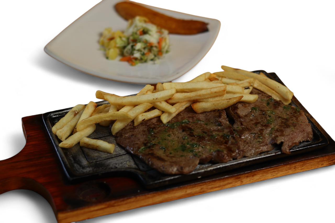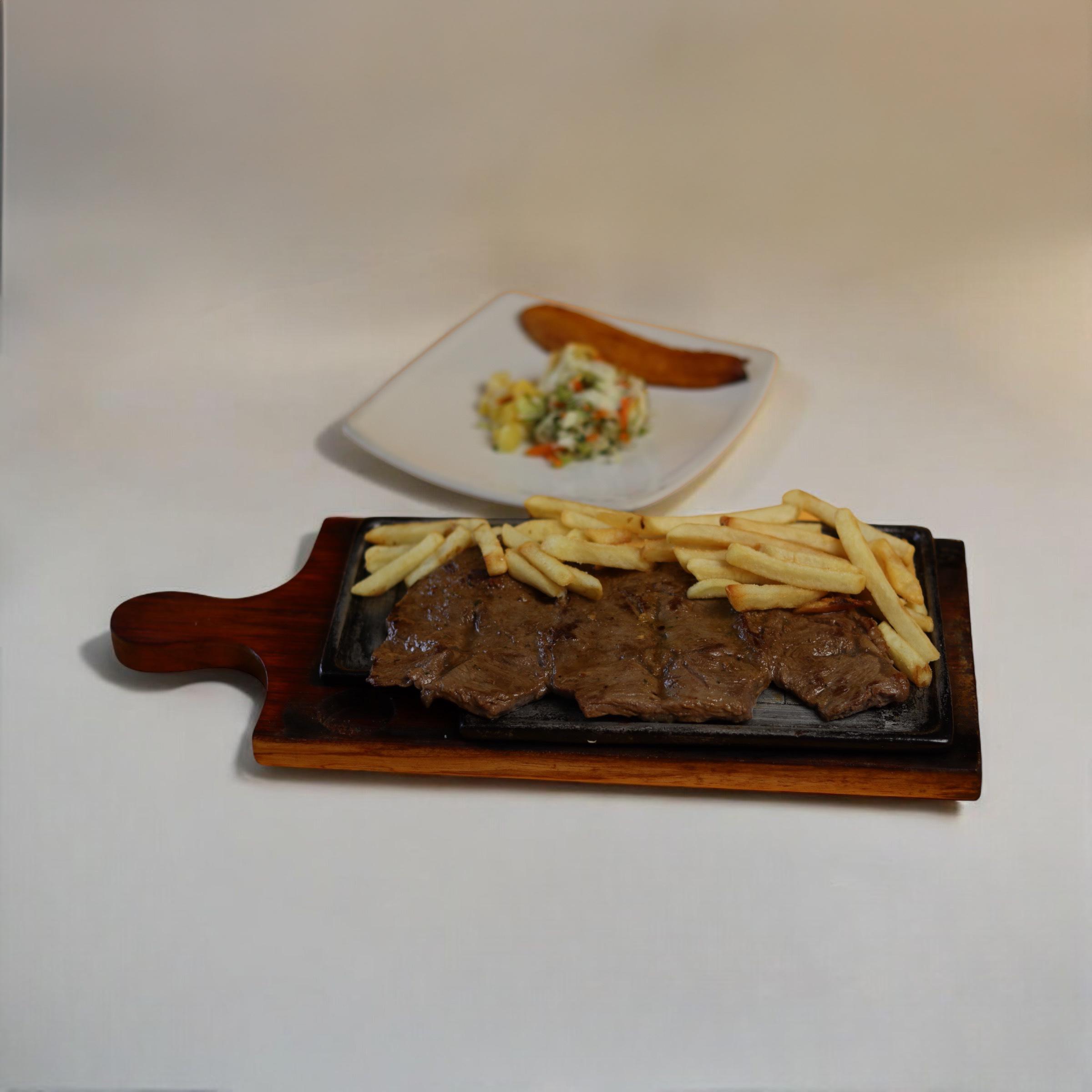 350G de lomo de caracho. acompañado con papas a la francesa, ensalada de la casa y maduro.