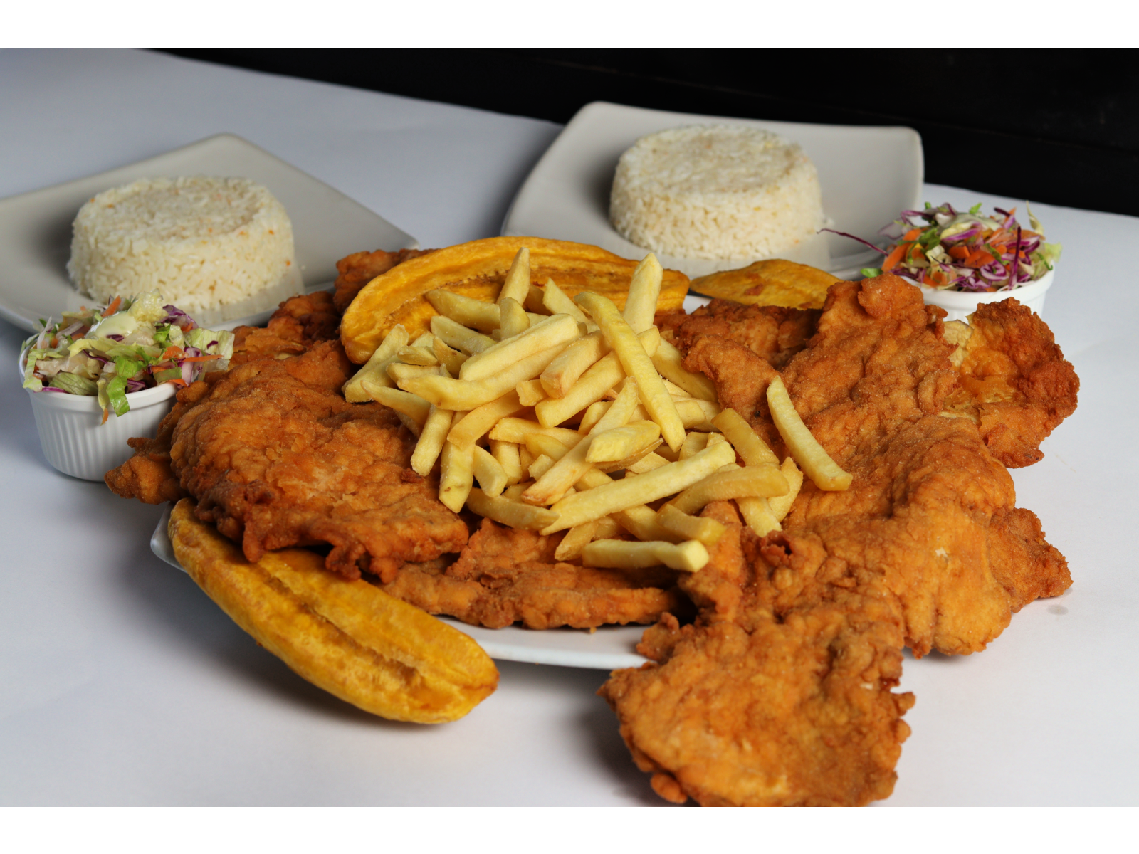 Chuleta de Pollo, Cerdo o Mixta Pinino de 1000g, acompañada de porción de papas a la francesa, tres porciones de arroz, dos ensaladas de la casa y tres maduros.