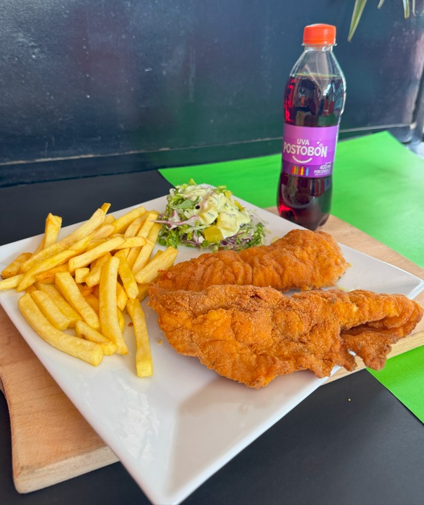 Chuleta de Pollo acompañada de papas a la francesa, ensalada y gaseosa Postobon de 400ml (Sabor Disponibilidad de la sucursal).