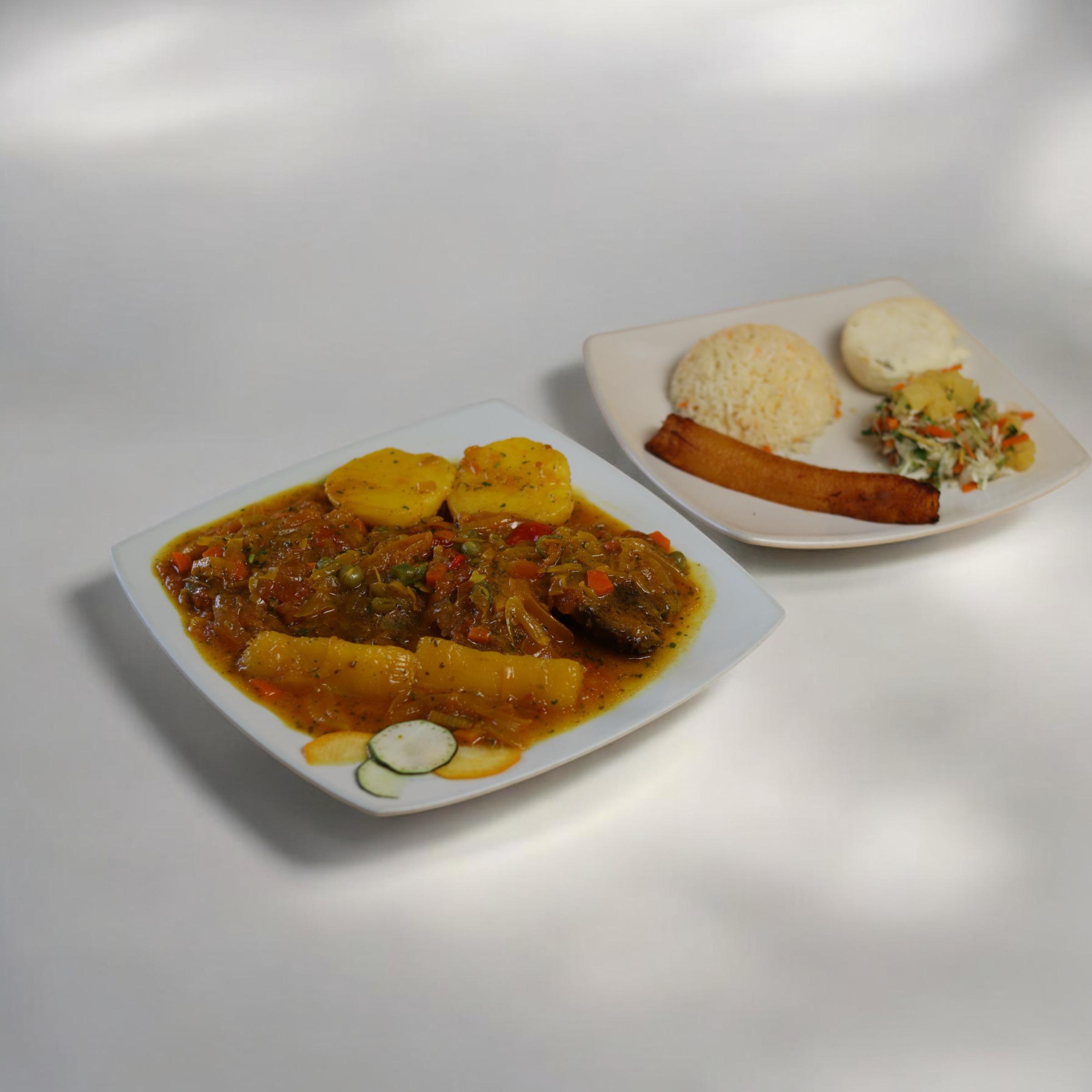 Porción de plátano verde con guiso.