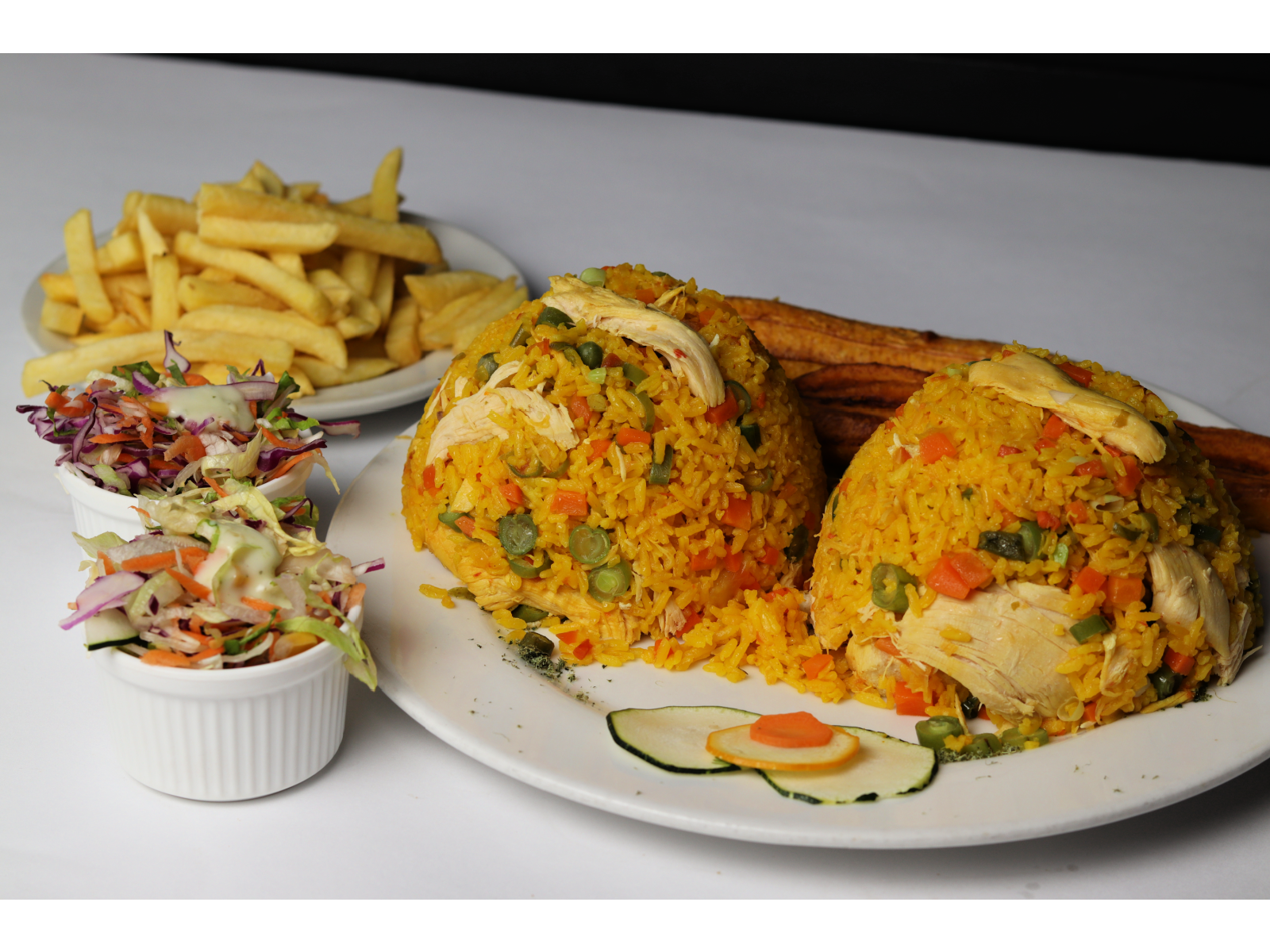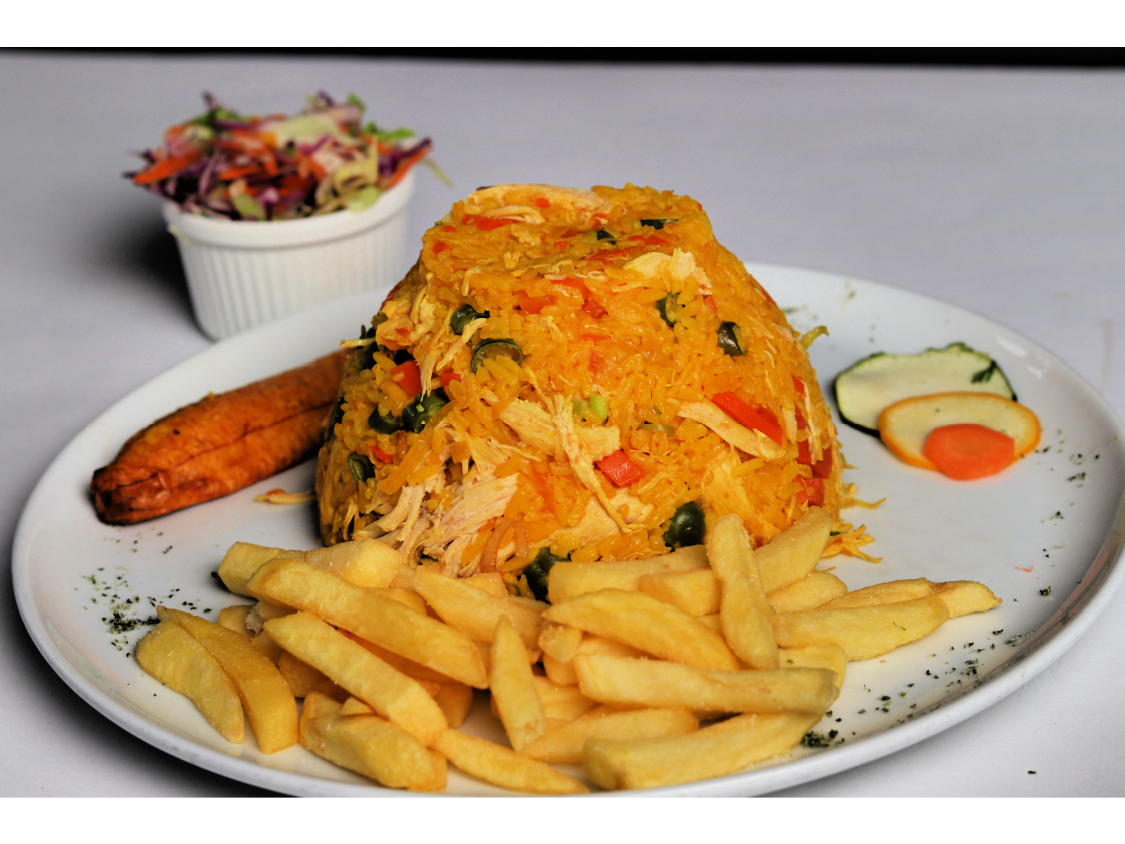 Arroz con Pollo acompañado de Papas a la francesa, maduro y ensalada de la casa.