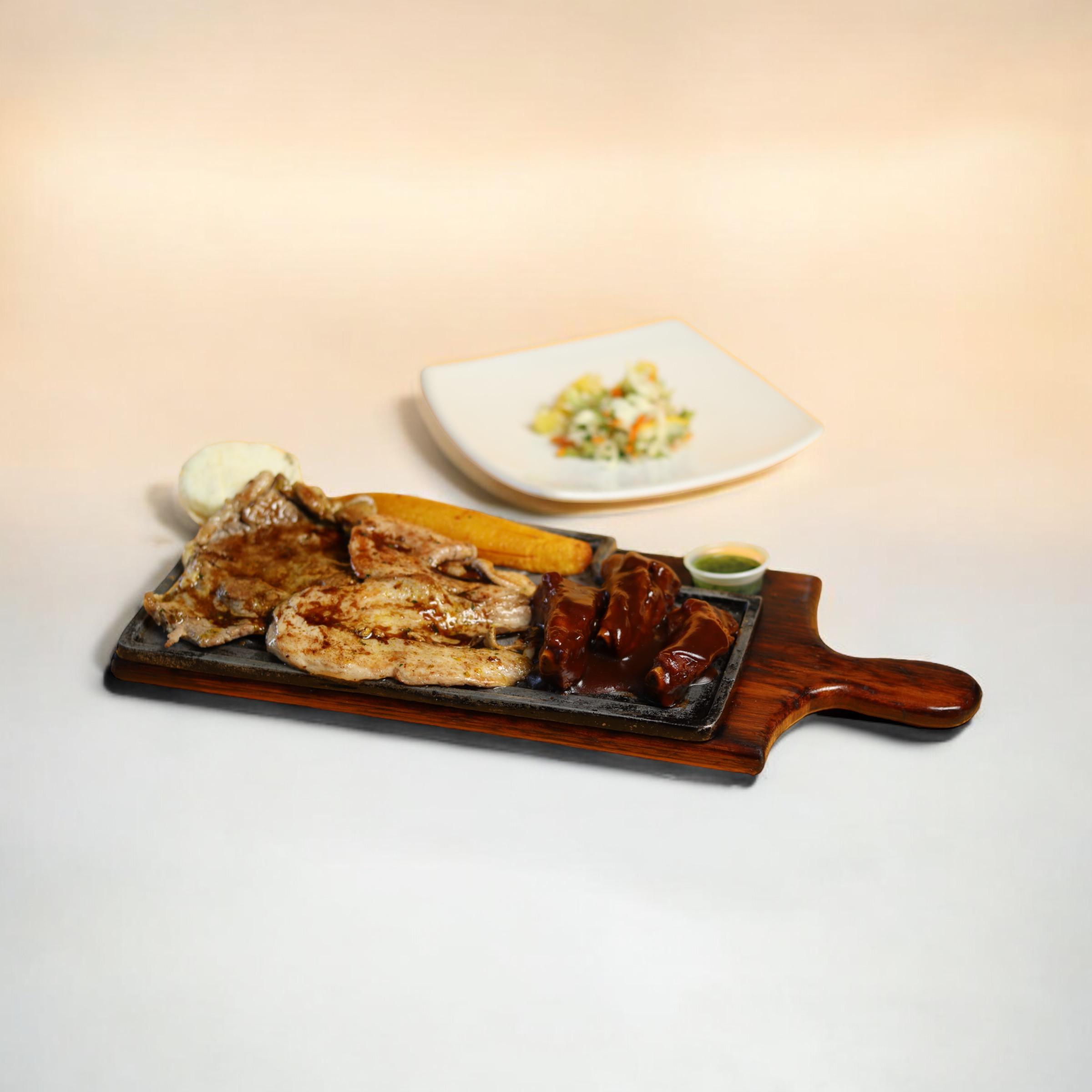 3 proteínas: carne de res, filete de pollo y costillas de cerdo en salsa bbq. acompañados de papa al vapor, ensalada de la casa, maduro y arepa.