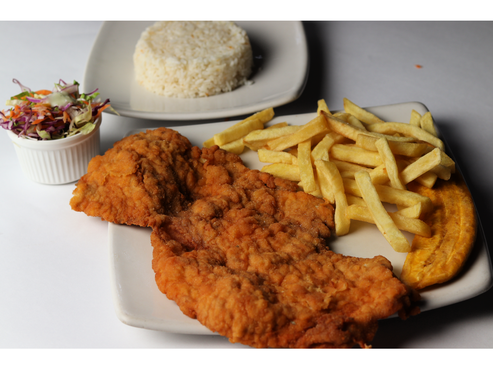 Chuleta de Pollo Pinino 500g, acompañada de porción de papas a la francesa, dos porciones de arroz, ensalada de la casa y maduro.