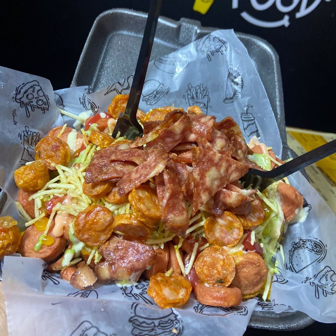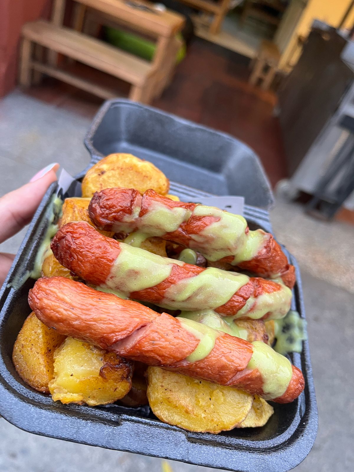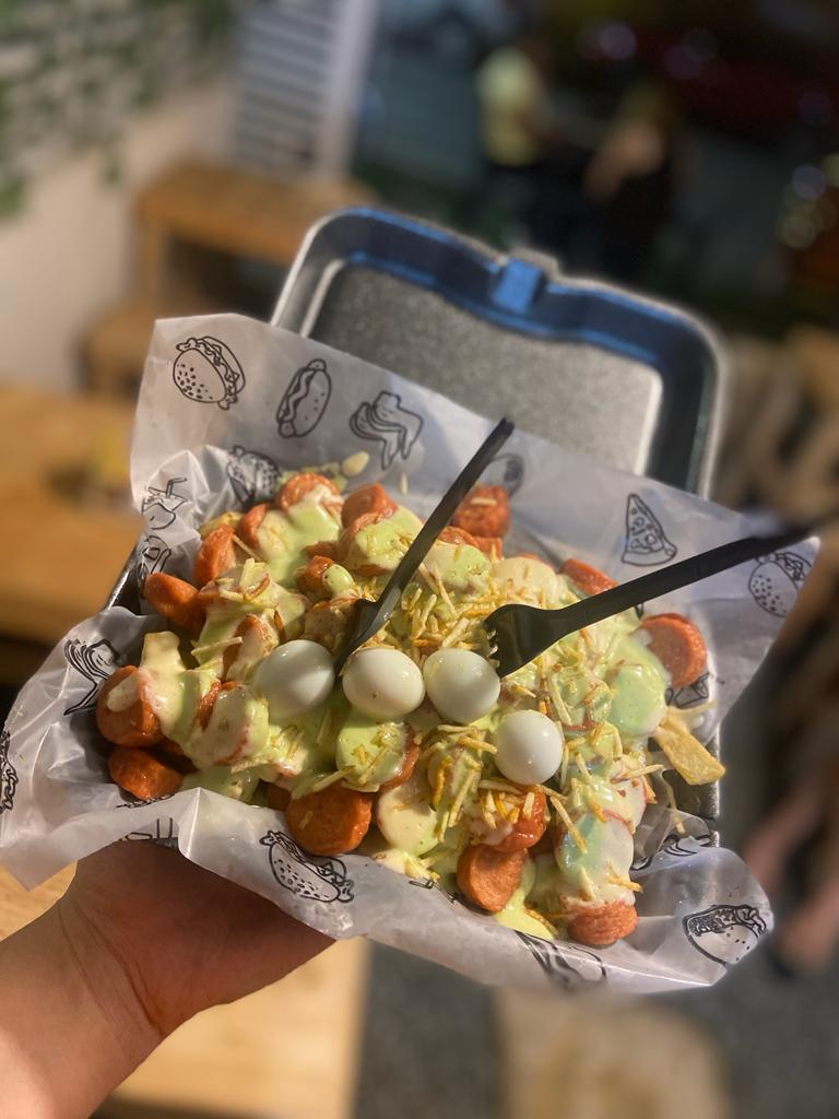Papas, salchicha, queso mozzarella gratinado, huevo de codorniz, salsas (tomate, mayonesa, BBQ, mostaza, piña), para 2 personas.