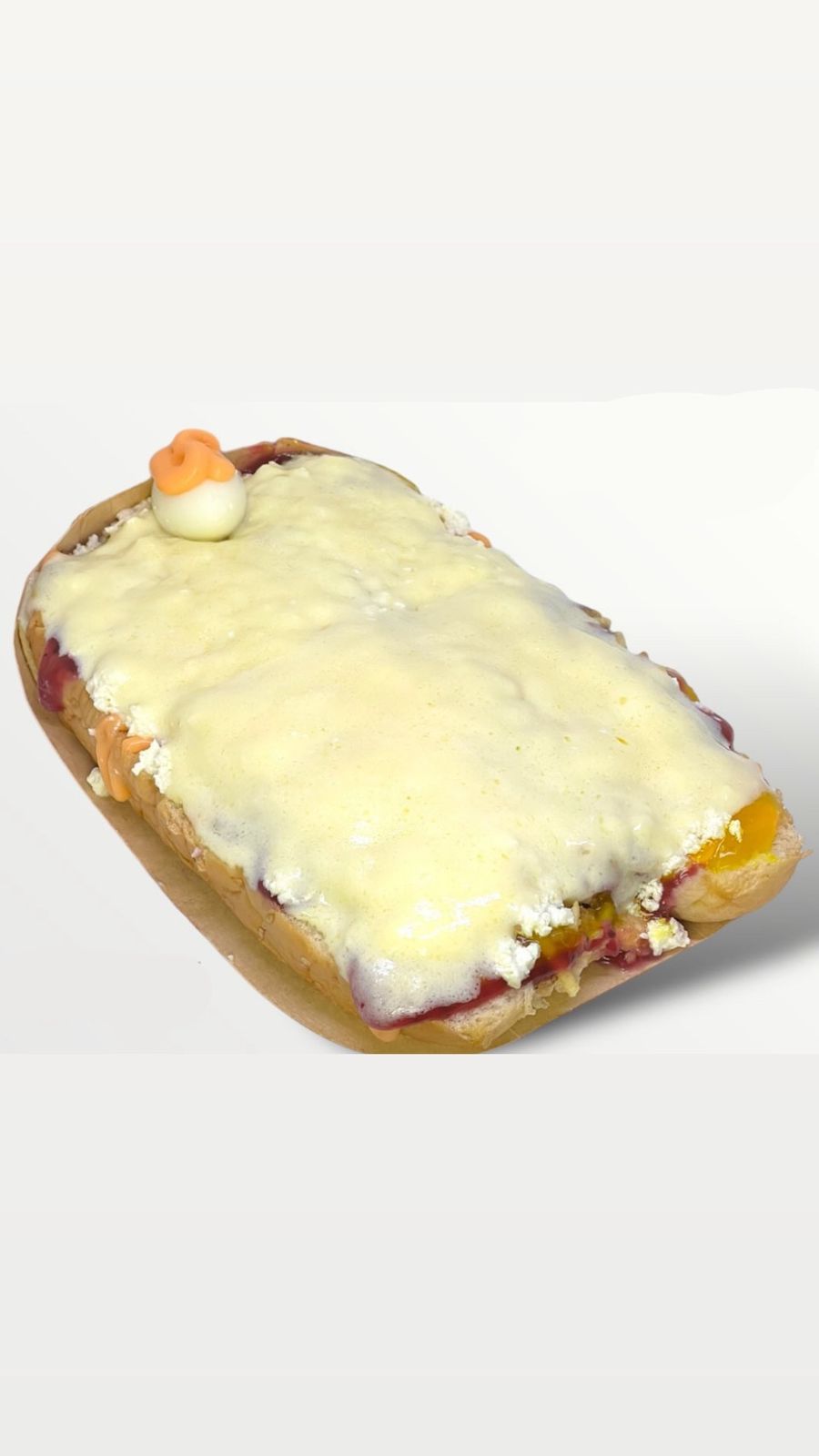 Papas, salchicha, queso mozzarella gratinado, huevo de codorniz, salsas (tomate, mayonesa, BBQ, mostaza, piña), para 1 persona.