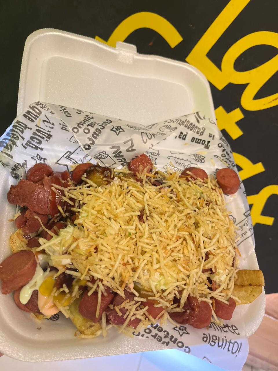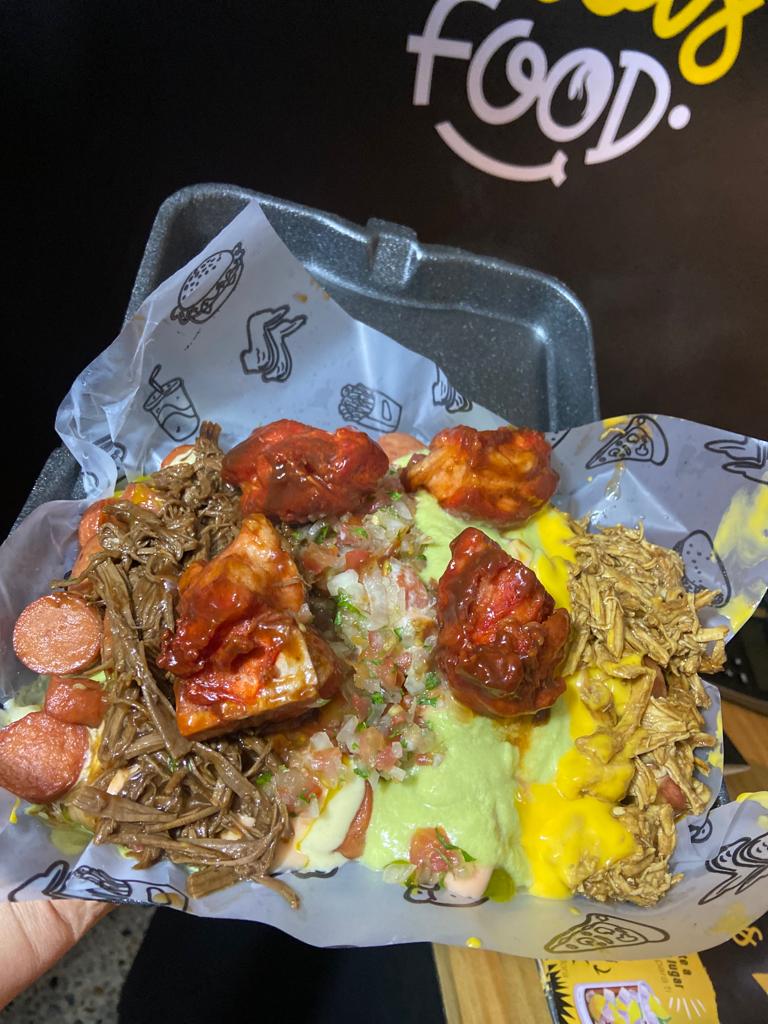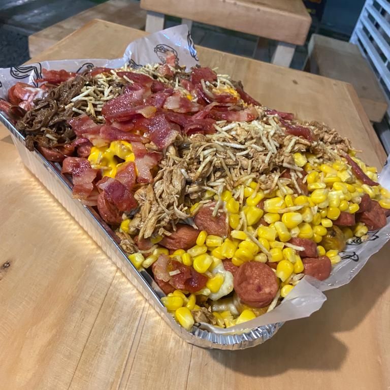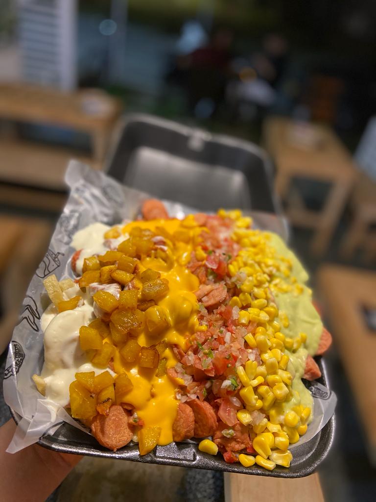 Papas, salchicha, cheddar, queso mozzarella, queso crema, ripio de papa, pico de gallo, maicitos, madurito, guacamole, salsas (tomate, mayonesa, BBQ, mostaza, piña), para 2 personas.