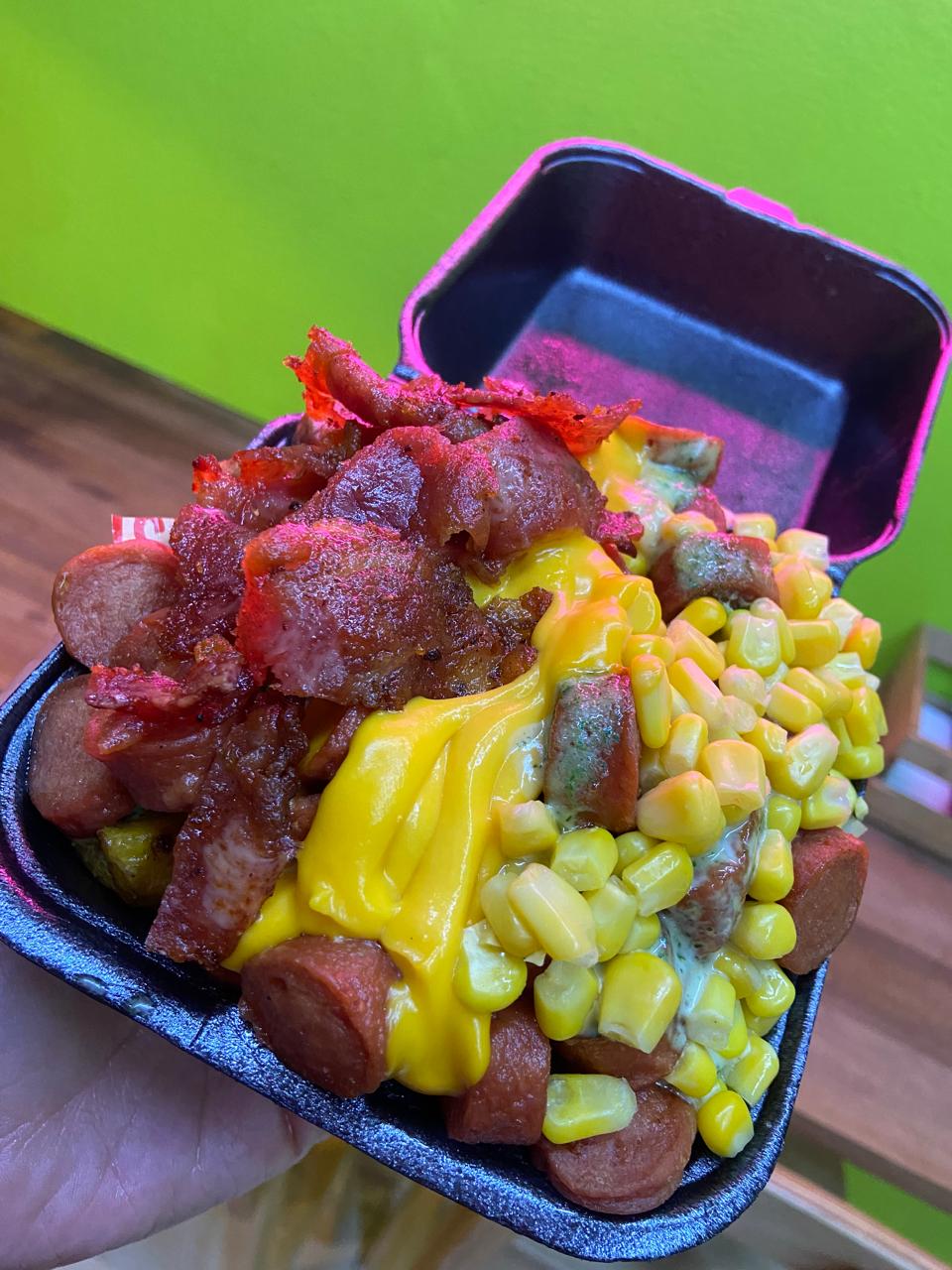 Papas, salchicha, queso cheddar, queso mozzarella, queso crema, tocineta, huevo de codorniz, pollo, carne desmechada, maicitos, ripio de papa, salsas (tomate, mayonesa, BBQ, mostaza, piña).