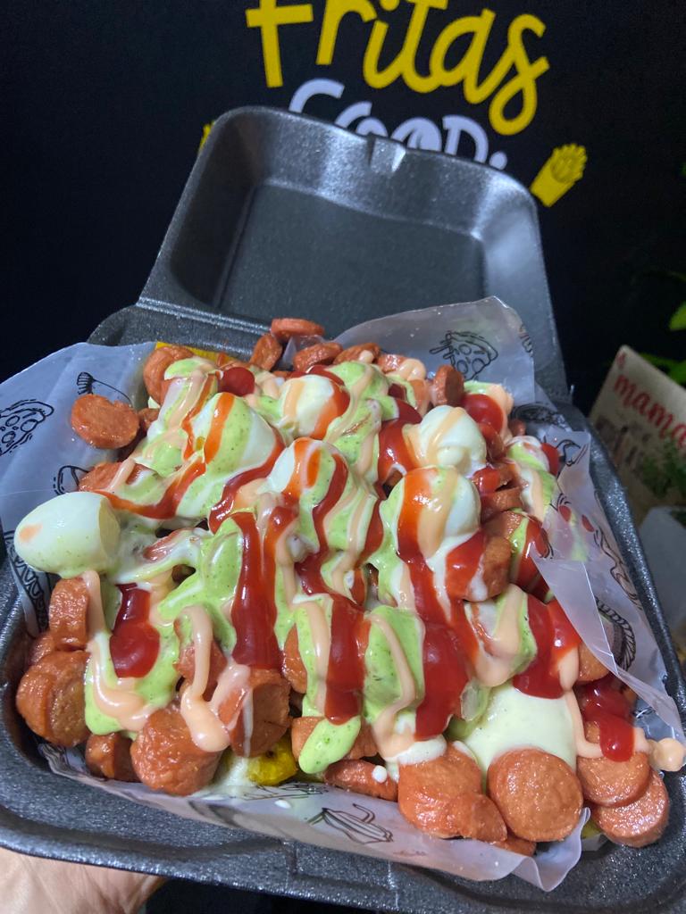 La Frita de la casa personal. papa amarilla o papa a la francesa salchicha tradicional queso rayado queso mozarella lechuga ripio de papa y salsas