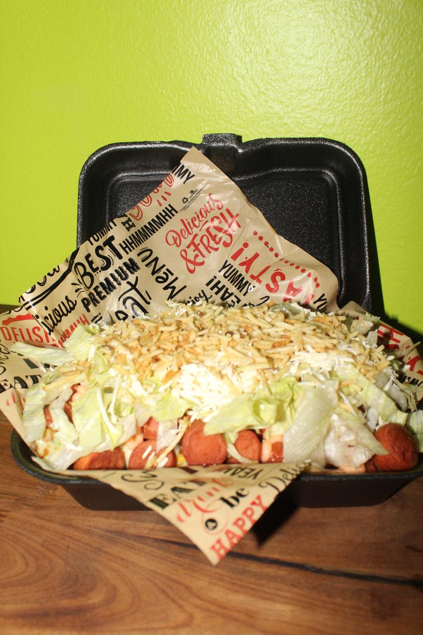 papa salchicha queso rayado queso mozarella lechuga ripio de papa ysalsas