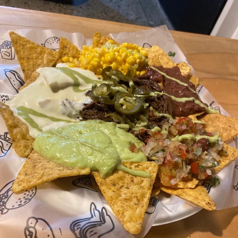 Totopos, queso mozzarella, sour cream, pico de gallo, maicitos, guacamole, proteína.