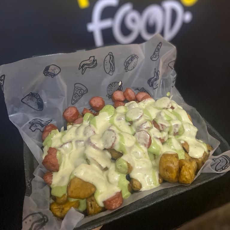 elige tu tipo de papa favorita, acompañada de salchicha, nuestras salsas exclusivas de la casa, un toque generoso de queso mozzarella derretido y coronada con crujiente tocineta que le da el flow perfecto a cada bocado.