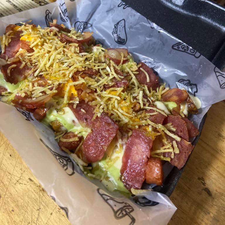 Papas, salchicha Ranchera, tocineta, queso cheddar, queso mozzarella, ripio de papa, salsas (tomate, mayonesa, BBQ, mostaza, piña), para 2 personas.