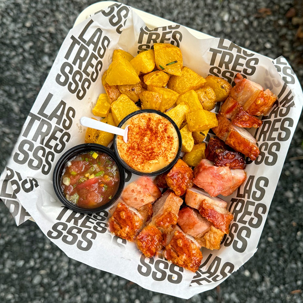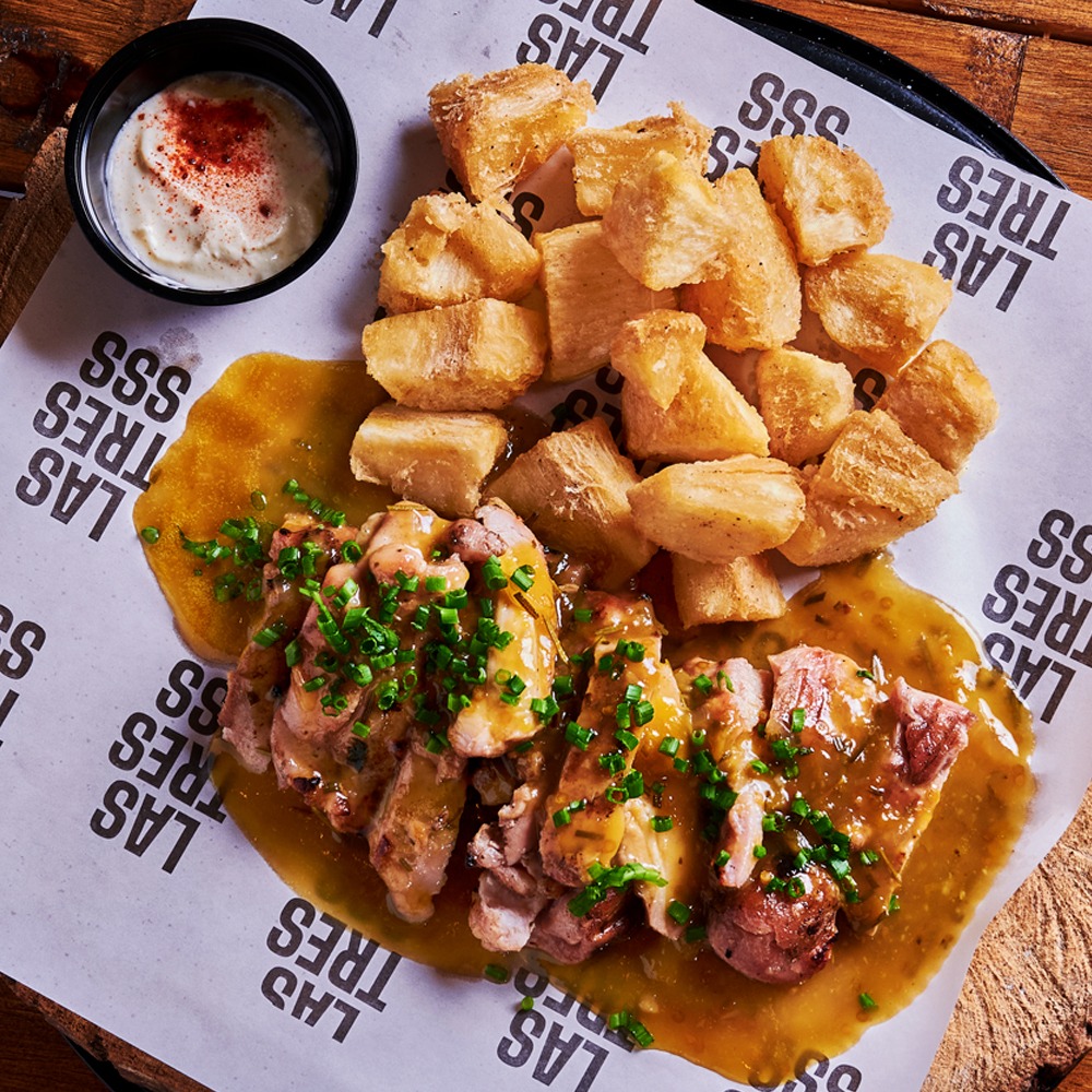 500 g Aprox de chicharrón crocante carnudo, con yuca al vapor o papa amarilla con ají de hierbas y chimichurri mustard.(peso de la proteína en crudo).