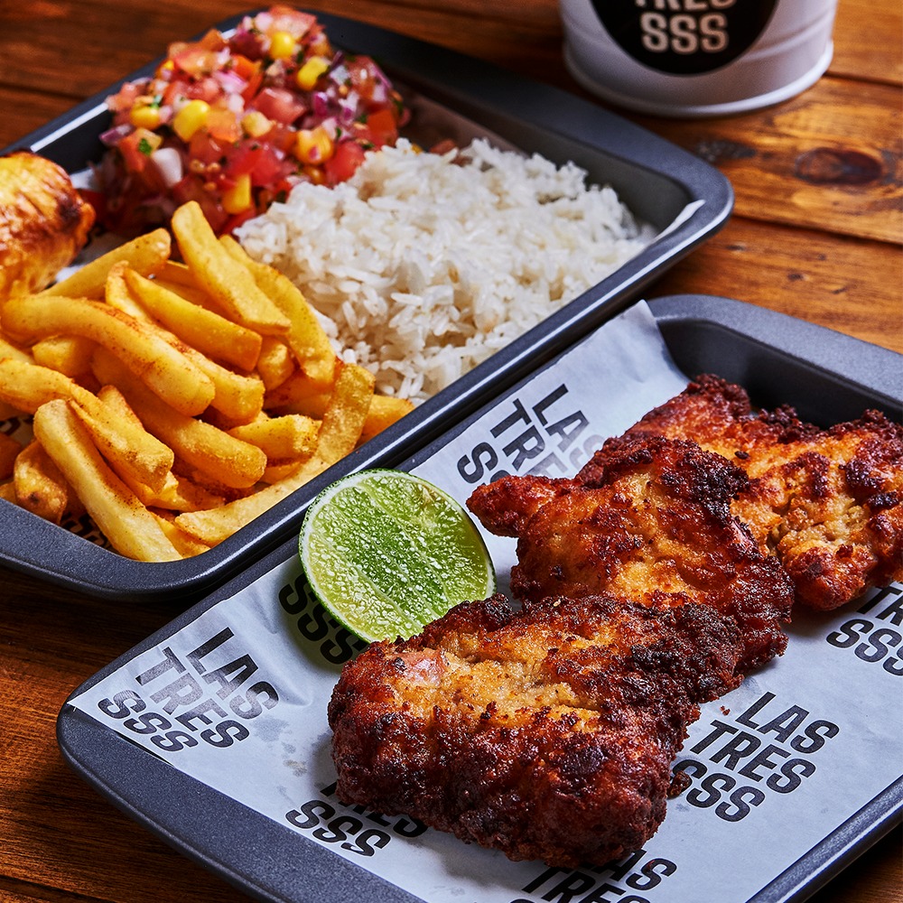 Churrasco de pollo apanado, acompañado de papas a la francesa, arroz blanco, pico e gallo y plátano maduro.