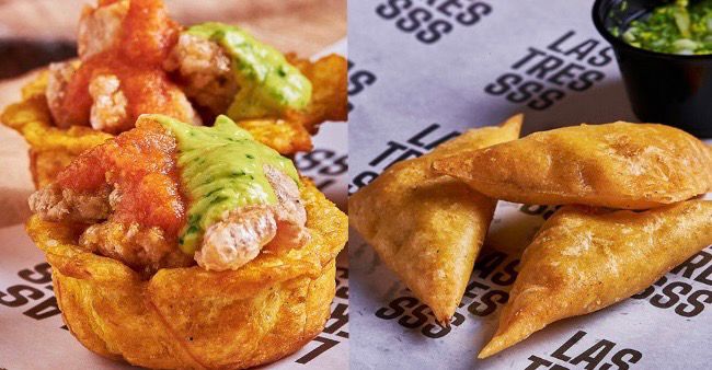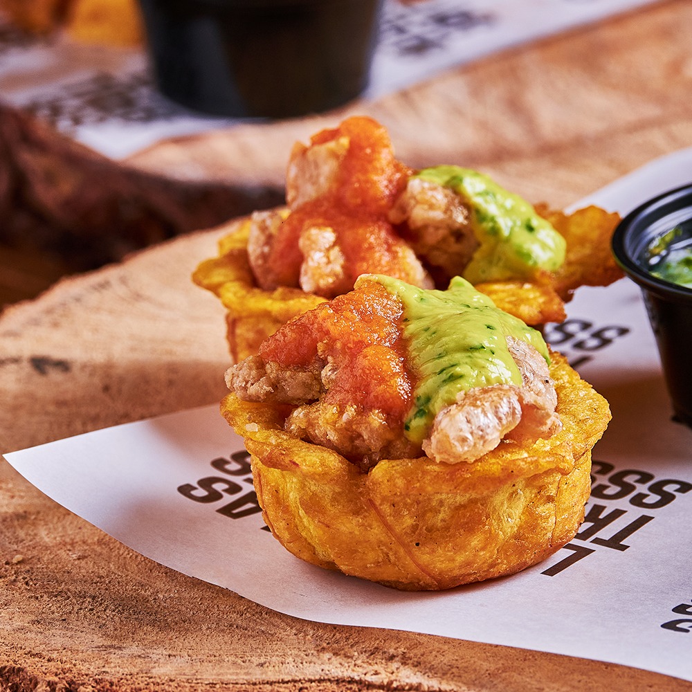 Canasticas de plátano verde rellenas de chicharrón, con hogao y guacamole (2 unidades).