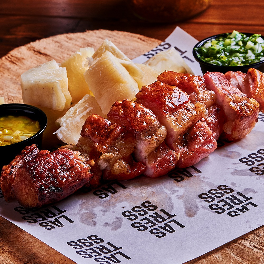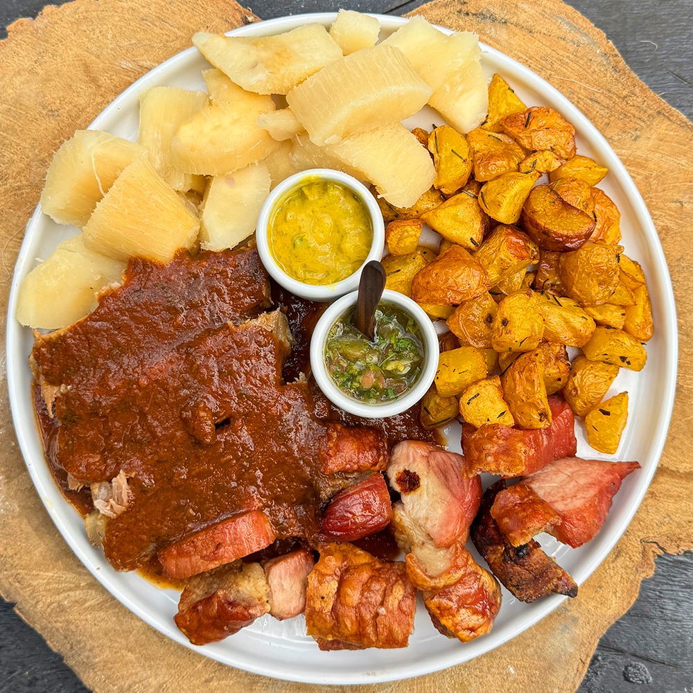 Carne de res, churrasco de pollo, bondiola y chorizo de cerdo, con pico de gallo, papa parda y plátano maduro con sour cream y chimichurris.