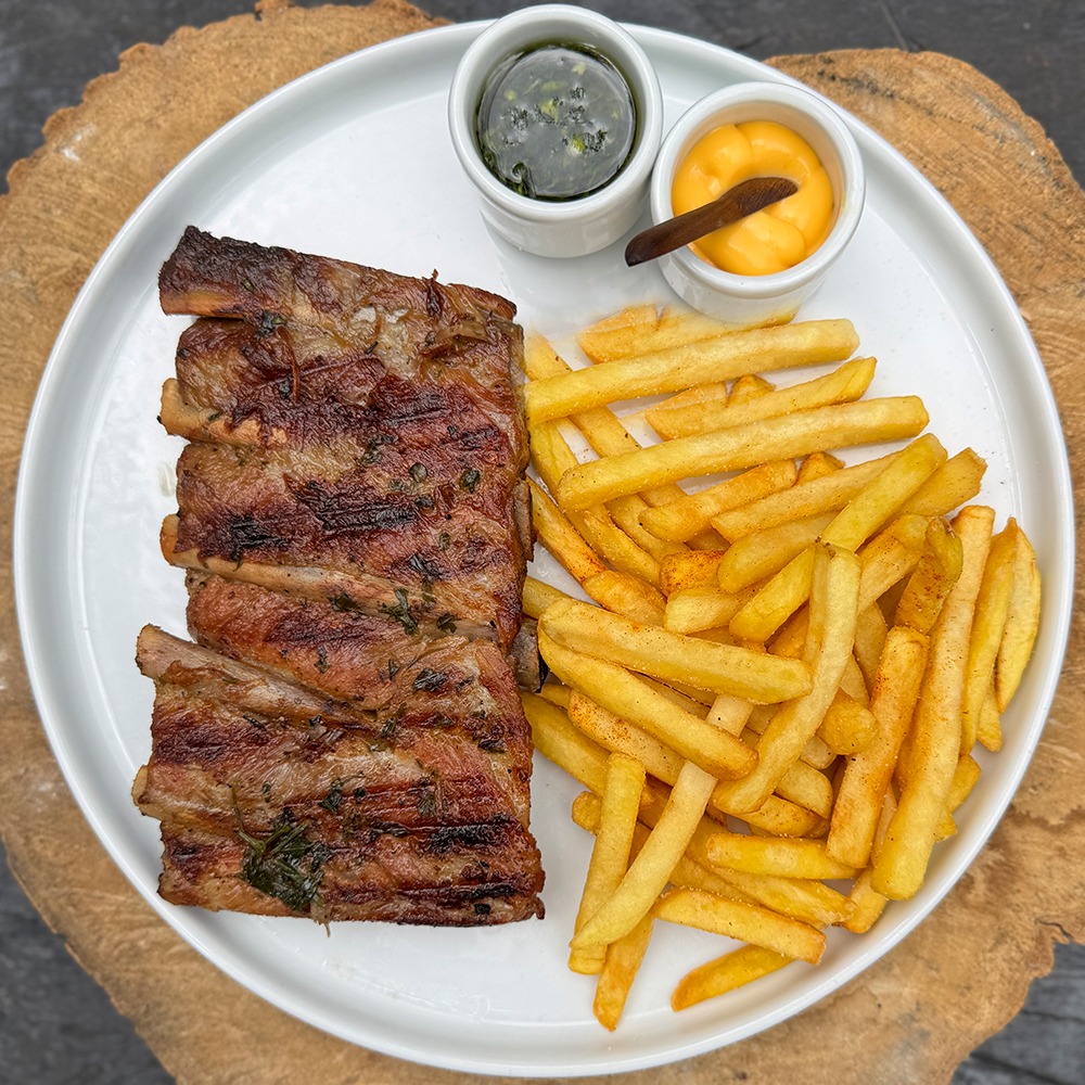 400 g Aprox de costilla de cerdo, horneada por 4 horas y terminadas a la parrilla, extra tierna con papas a la francesa, chimichurri clásico y salsa de queso. (peso de la proteína en crudo).