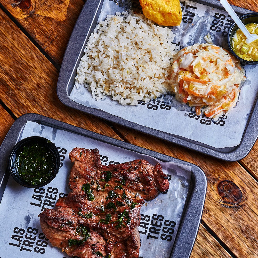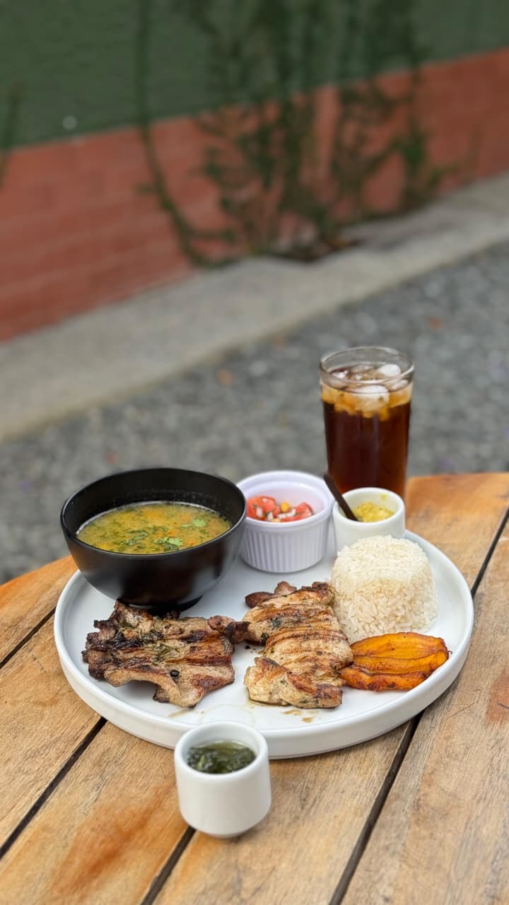 120 g de bondiola de cerdo asada al carbón + 120 g de churrasco de pollo jugoso (pesos en crudo). Acompañada de arroz blanco, plátano maduro, pico e’ gallo, chimichurri verde y nuestro chimichurri amarillo de la casa. Incluye sancochito o sopa de pastas y vaso de té helado.
