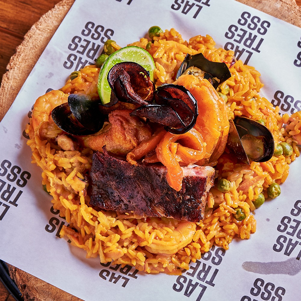 500 g Aprox de arroz mixto de mariscos, gambas, camarones, mejillones, pulpo, colombina, costilla San Luis, anillos de calamar.