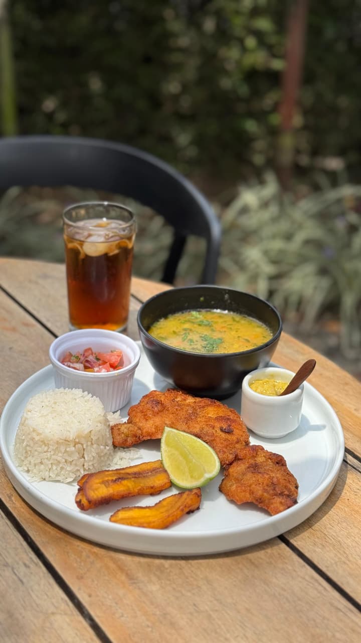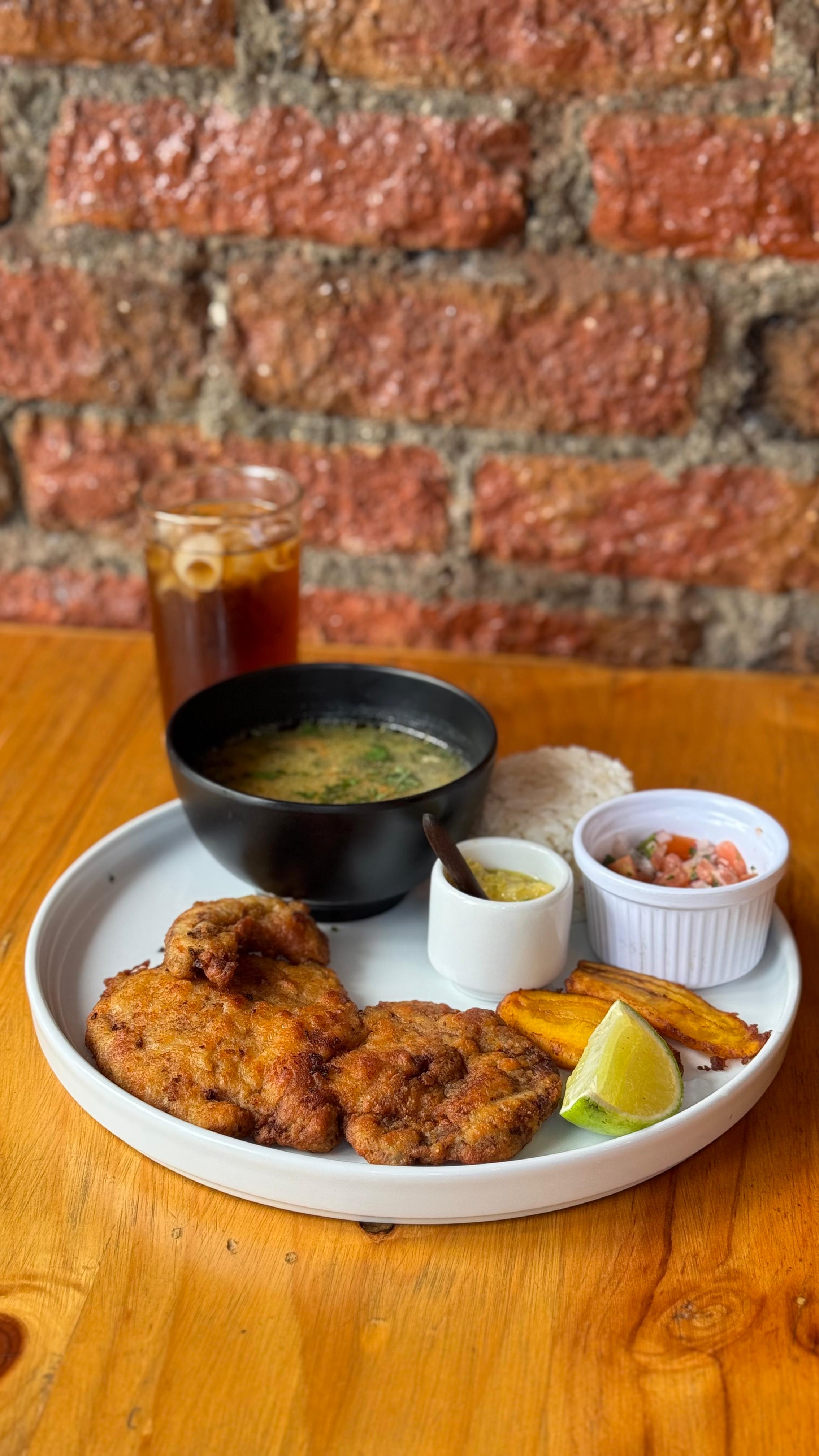 Bondiola de cerdo apanada al punto, servida con arroz blanco, plátano maduro, pico e’ gallo fresco y nuestro exclusivo chimichurri amarillo de la casa. Incluye sancochito o sopa de pastas y vaso de té helado.