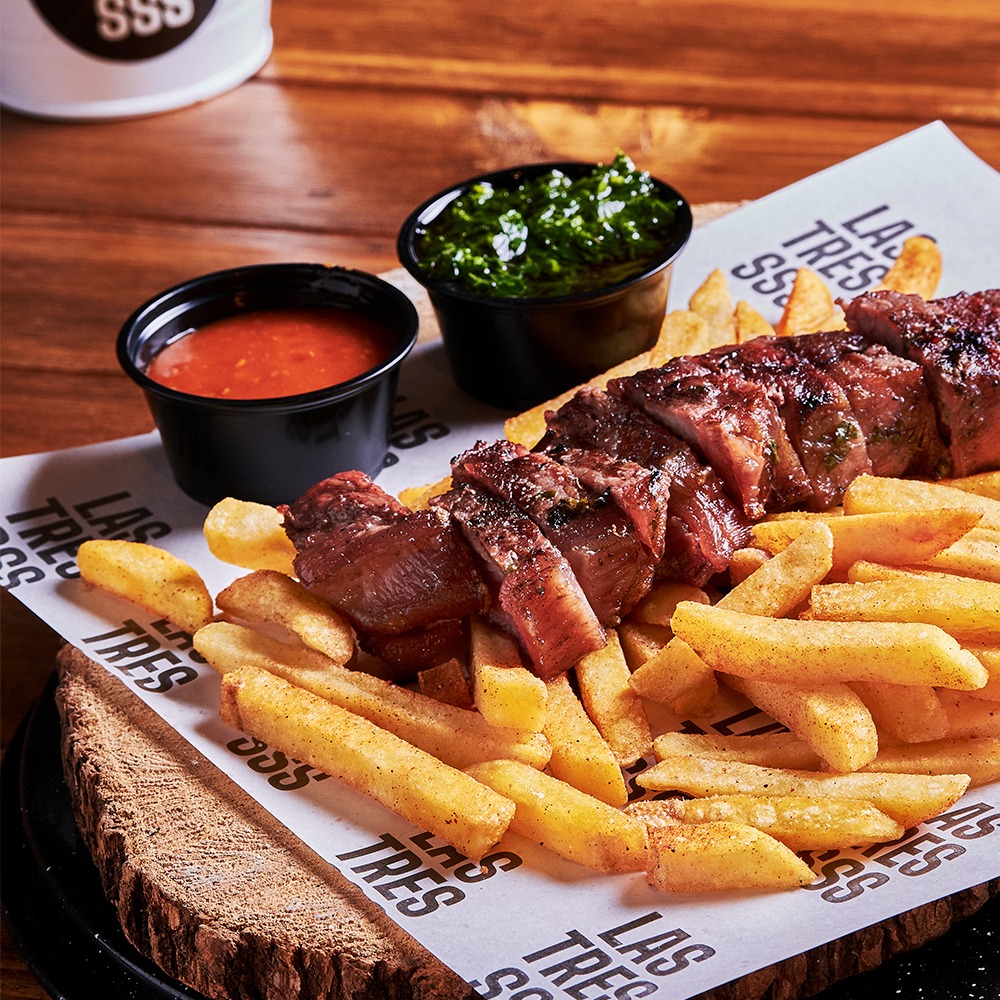 Lomo caracho angus asado al carbón, acompañado con papas a la francesa, chimichurri y sour cream.