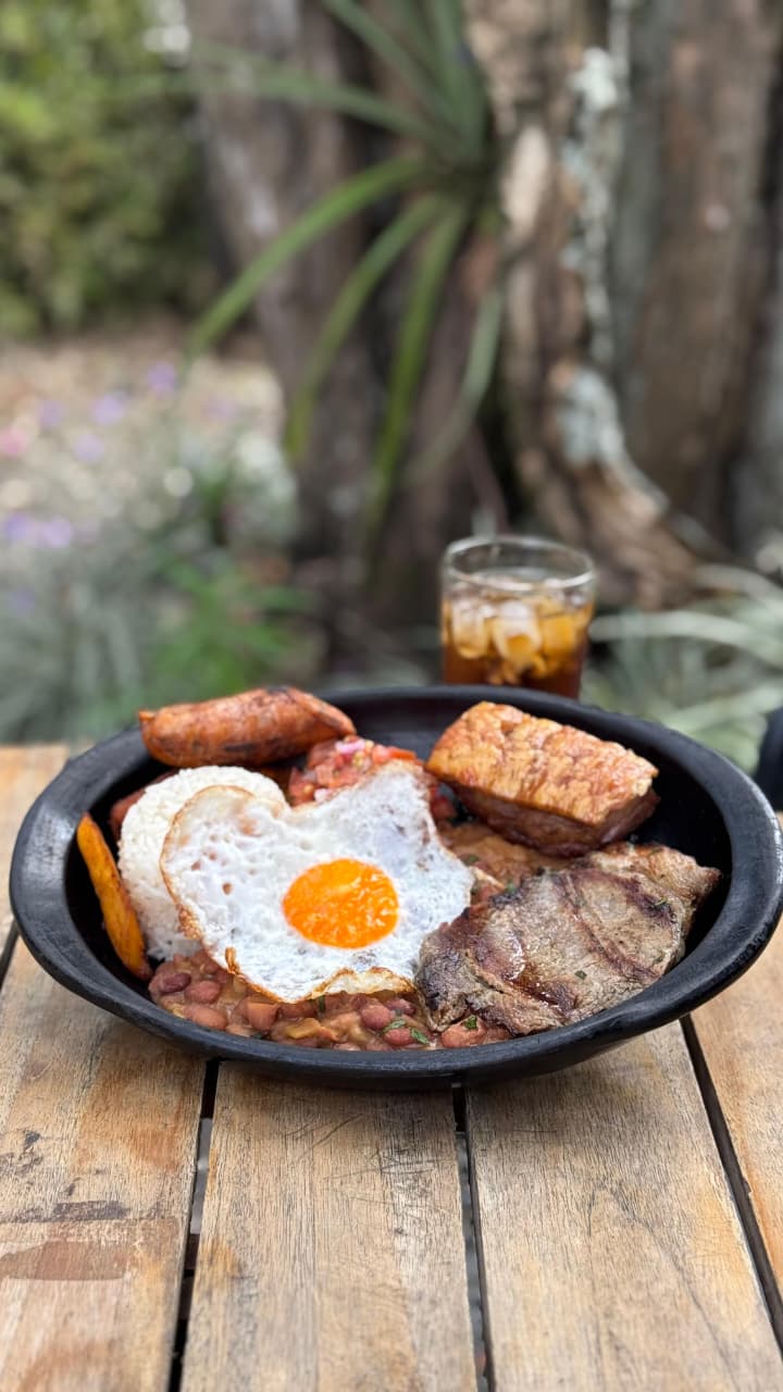 Un clásico cargado de sabor: bondiola jugosa, chicharrón crocante, chorizo artesanal, huevo frito, frijoles caseros, plátano maduro en su punto, arroz blanco y pico e' gallo fresco. ¡Todo lo que te gusta en una sola bandeja! Incluye vaso de té helado.