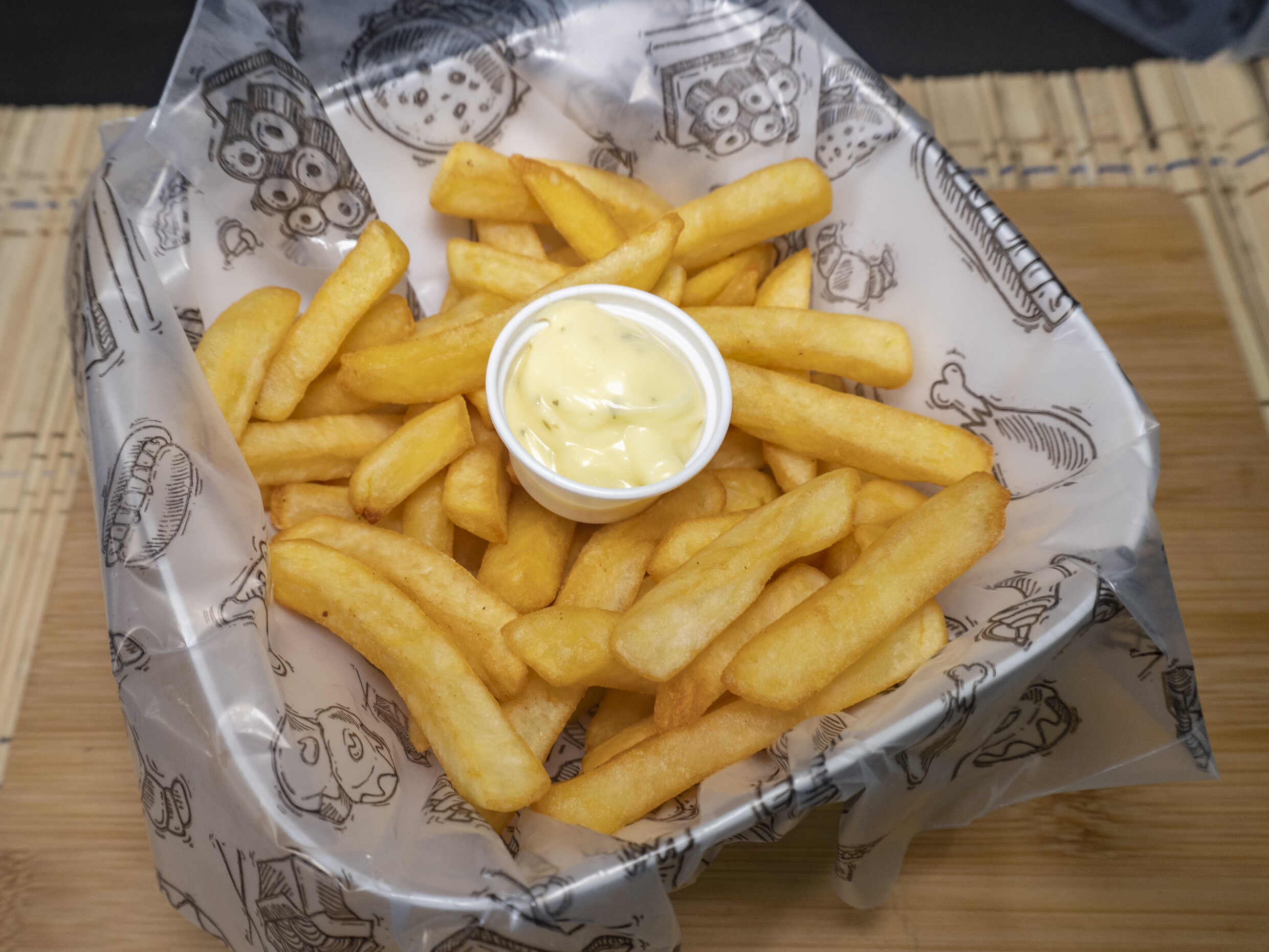 Salchicha, papa amarilla o francesa y salsas, 200 gr aprox.