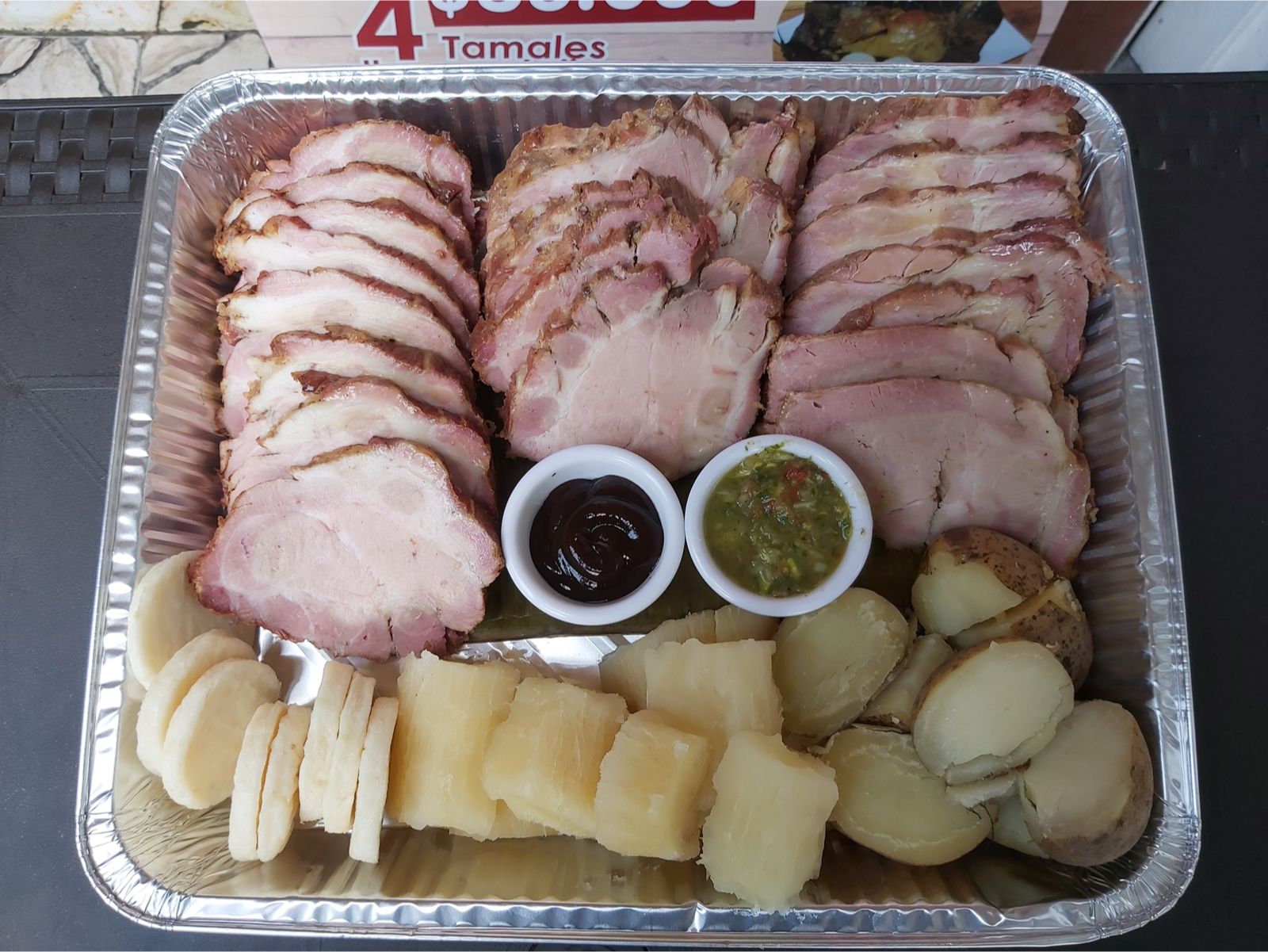 2400 gramos de matambre de cerdo ahumado, con papa, yuca, arepa, guacamole y salsa BBQ.