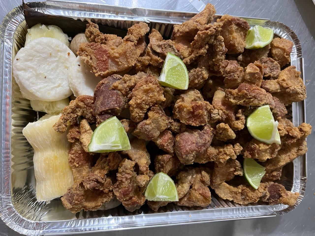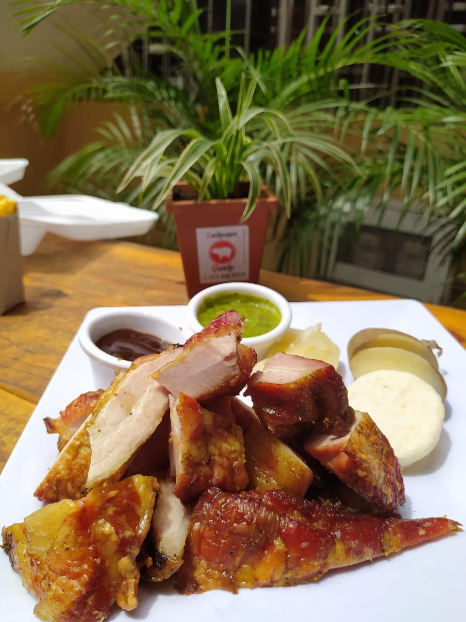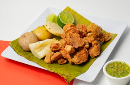 1.600 gramos Panceta de cerdo crujiente con papa, yuca, arepa, guacamole, chimichurri y limón.