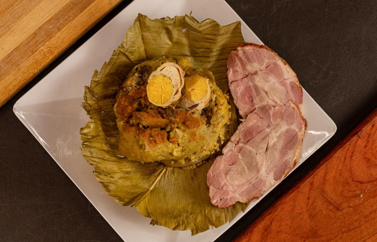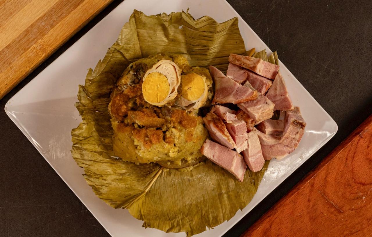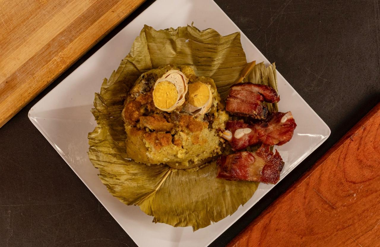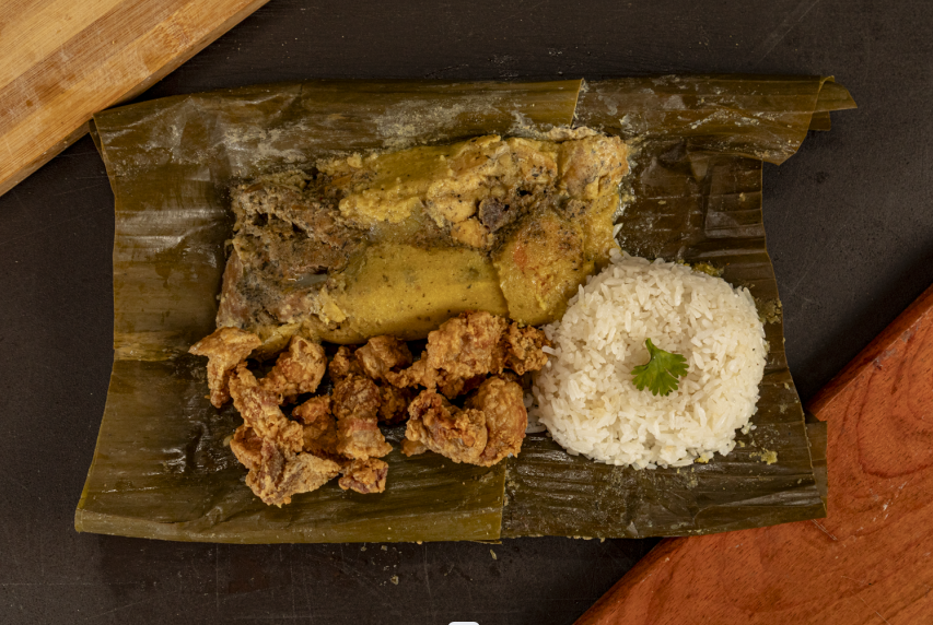 Plato típico vallunos a base de maíz con verduras, cerdo y pollo envuelto en hoja de platano con arroz y porcion de costilla ahumada.
