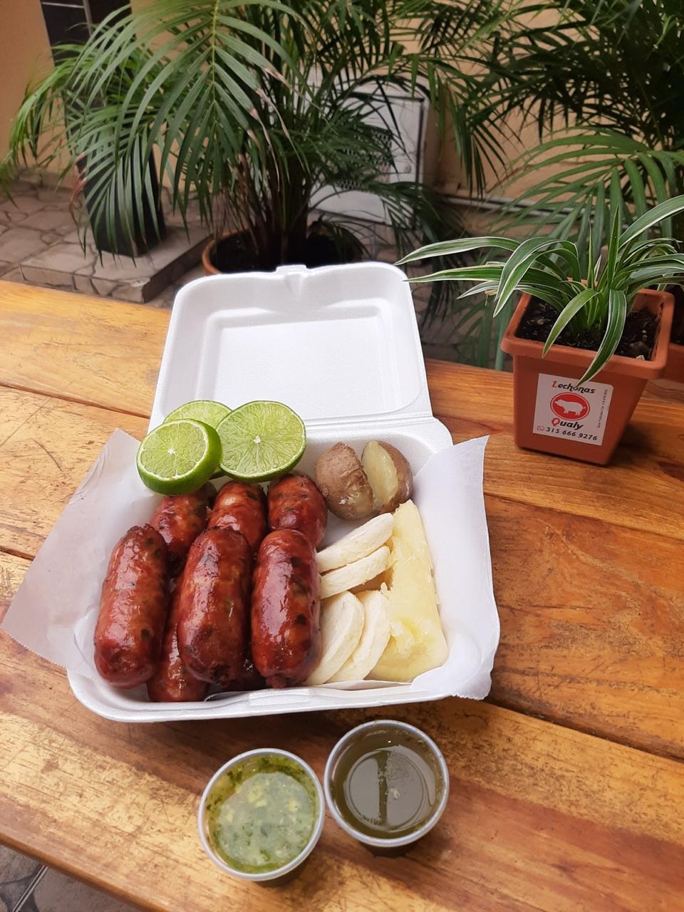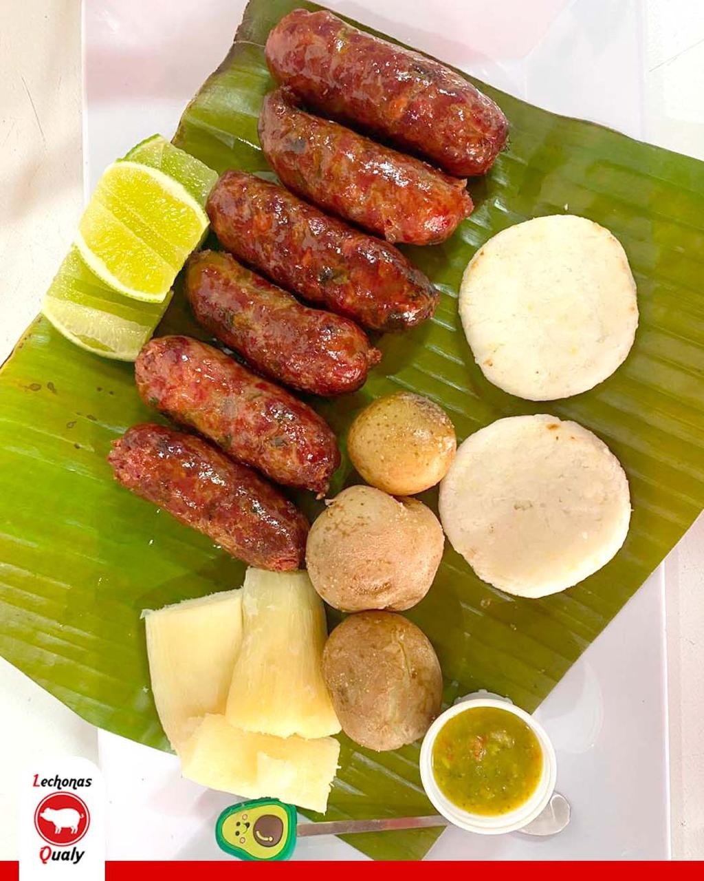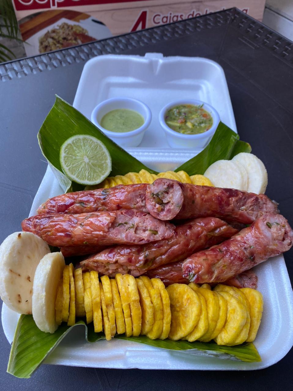 Embutido artesanal de cerdo, con platanitos fritos, arepas, guacamole, chimichurri y limón.