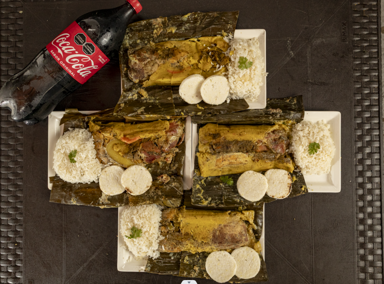 4 Unidades tamales vallunos, plato típico a base de maíz con verduras, cerdo y pechuga de pollo envuelto en hoja de platano y acompañado por arroz blanco mas bebida coca cola 1.5 litros. de arroz, con verduras, huevo, cerdo y pollo envuelto en hoja de platano + Coca-Cola 1.5 L.