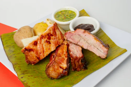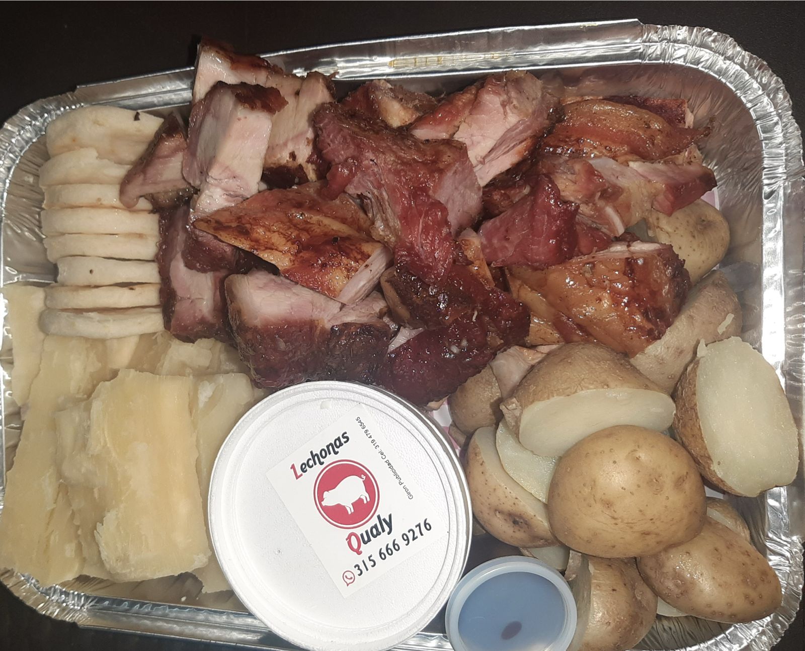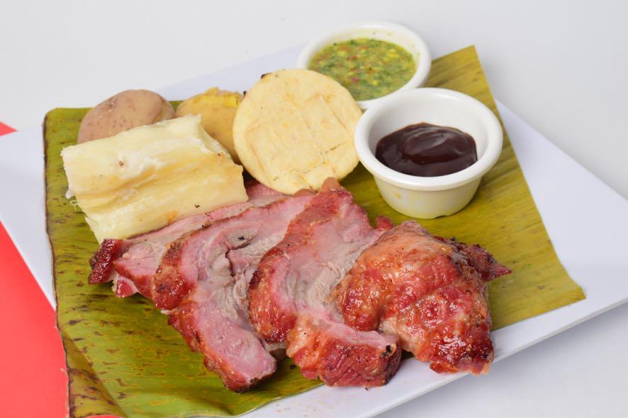 600 gramos De bondiola y falda de cerdo horneadas, con papa, yuca, arepa, guacamole y salsa BBQ.