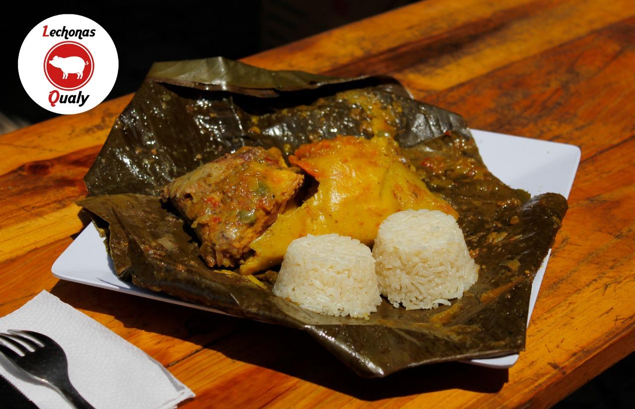 Plato típico vallunos a base de maíz con verduras, cerdo y pollo envuelto en hoja de platano y acompañado por arroz.