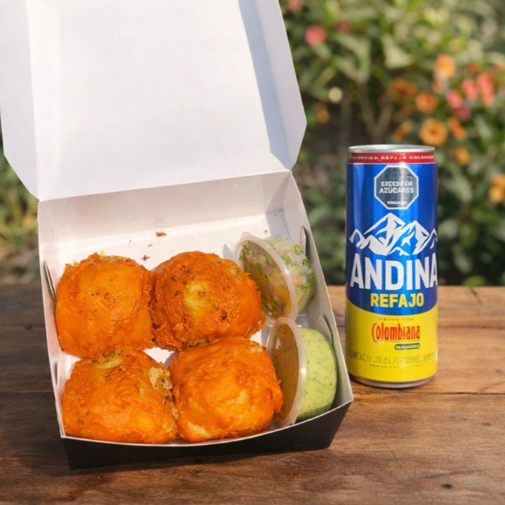 ¡El matrimonio perfecto! Disfruta de 4 potentes papas rellenas de auténtica lechona (cerdo, arroz y arveja), crujientes por fuera y jugosas por dentro. Acompáñalas con el toque refrescante de dos refajos frios en lata. ¡Sabor criollo 100%!